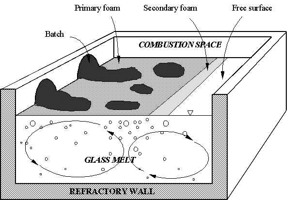 The quality of glass products is degraded if gas bubbles and unfused silica grains remain in the molten glass as it is being pulled out of the furnace. Fewer defects, especially fewer remaining bubbles, has become a major requirement in the new quality standards for many commercial glass products. For example, in the TV glass production, a rate of six bubbles per ton of glass results in 10% rejection rate of the final product, and for new products such as High Definition Television, the quality standards are even more stringent. For automobile glass, the most demanding specification requires that gas bubbles be less than 0.5 mm in diameter for transparency purposes. Moreover, for windshield glass, reducing by half the defect density would increase the profitability by more than 2 millions dollars per year. Consequently, understanding and modeling of the behavior of gases and bubbles in the glass melt are of great interest to the glass industry, both from a technological and an economical viewpoints. The approach consists of solving the population balance equation for the bubble density function accounting for bubble generation, bubble growth due to changes of pressure as well as diffusion of gases in and out of the bubbles. The number density function f1 is a function of the spatial coordinates (x,y,z) as well as the bubble radius r and the concentration of gases contained in the bubbles, i.e., f1=f1(x,y,z,r,Cb,i). Numerical solution of the intregro-differential governing equation for the number density function is currently being explored with the precious help of Prof. D. Ramkrishna. This project is closely related to studies on foam dynamics and steady-state thickness as well as to work on radiation heat transfer in semi-transparent media containing gas bubbles. Publications