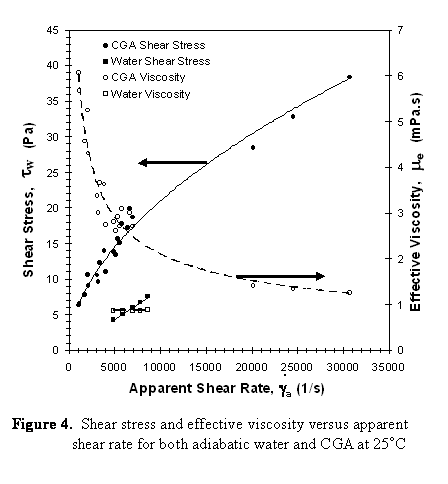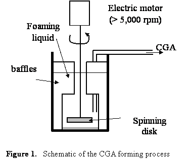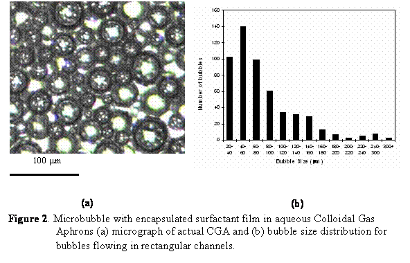Colloidal Gas Aphrons (CGA), also called microfoams, consist of bubbles between 10 and 100 mm in diameter with a porosity of up to 70%. They can be produced by stirring an aqueous surfactant solution contained in a fully baffled beaker at room temperature, as described in Figure 1. The solution is stirred by a spinning disk driven at 5,000 to 10,000 rpm by an electrical motor. Two to four baffles are equally spaced around the container and extend well above the surface of the solution. Once a critical stirring speed has been reached, waves are produced at the liquid surface. The waves beat up against the baffles and are forced to re-enter the liquid at the baffles. It is believed that the re-entering liquid carries a thin film of gas which becomes sandwiched between the liquid and the baffle. Such a thin film is unstable and breaks into microscopic bubbles encapsulated by a soapy shell, i.e. minute gas aphrons. After a few minutes of stirring, CGA forms and rises at the surface of the solution. It has been reported that CGAs made of water and surfactant solutions (i) have stable bubbles with a narrow and reproducible size distribution between 10 and 100 mm (see Figure 2), (ii) exhibit high stability, (iii) separate easily from the bulk liquid phase, and (iv) can be easily pumped through tubes while keeping their structure. However, even though the flow properties of CGA have been discussed qualitatively in the literature, to the best of our knowledge, no quantitative data on the rheology, pressure drop, and friction factor associated with CGA flow in pipes has been reported. Most applications of colloidal gas aphrons take advantage of (i) their large interfacial area, (ii) the adsorption of particles at the microbubble interfaces, and (iii) their stability for enhanced mass transfer. Possible applications include (1) separation, (2) oil recovery, (3) firefighting, (4) fermentation and bioreactors, (5) bioremediation, (6) material synthesis, and in general wherever macroscopic foams are currently being used. |