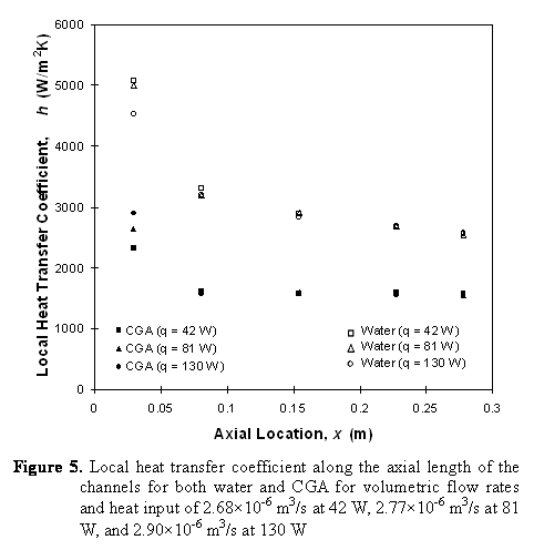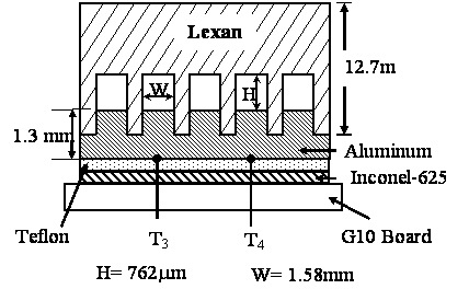 Five identical rectangular parallel mini-channels have been machine etched into Lexan ® polycarbonate top. They are mated with an aluminum bottom plate. An Iconel-625 strip is placed beneath the aluminum plate and has the same dimensions of 6.35 mm wide and 30.72 cm long. An additional Teflon ® strip of identical dimension is placed under the heating element to assure good thermal contact with the aluminum plate and provide electrical insulation. A Sorensen DC S8-125E power supply with voltage ranging from 0 to 60 volts and current ranging from 0 to 125A is used for resistance heating of the Iconel-625 strip. Each flow channel has a hydraulic diameter of 1.03 mm. Two Omega PX26-015DV pressure transducers are used to measure the overall pressure drop between the inlet and the outlet of the channels.