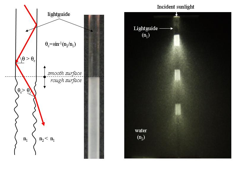The lightguides are made of glass or acrylic and can deliver sunlight deep into the photobioreactors by total internal reflection. At desired locations, the lightguides have rough surfaces and light ``leaks'' out providing the desired irradiance. For example, the Figure below shows a light delivery apparatus immersed in water featuring alternatively smooth and rough surfaces. Light is guided in the rod whose refractive index (n1) is larger than that of the surrounding liquid medium (n2< n1). The transparent rod can be made of glass or plexiglass. As the incident light is guided along the rod, it remains inside the rod as long as the angle of incidence at the rod/liquid interface remains larger than the critical angle for total internal reflection given by qc = sin-1(n2/n1). By adjusting the roughness profile the desired light delivery can be achieved. Note that the same principle applies to fiber optics which can also be used to deliver light inside PBRs.
