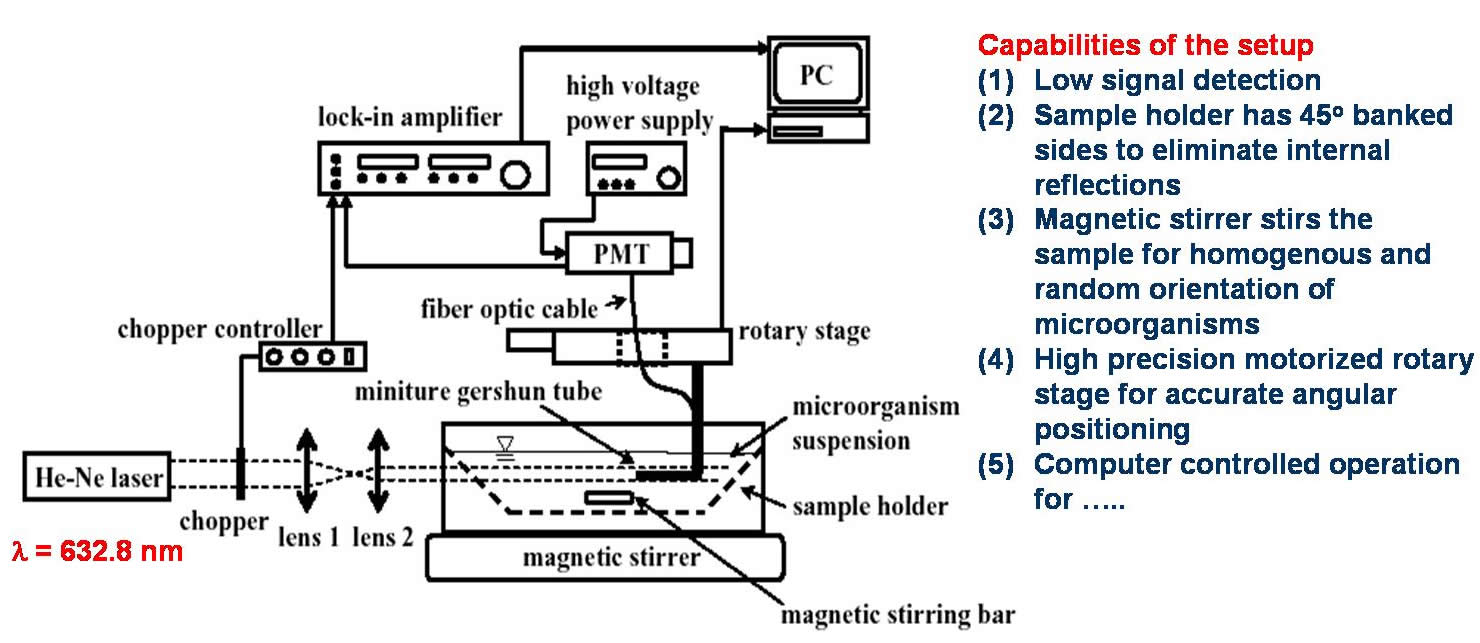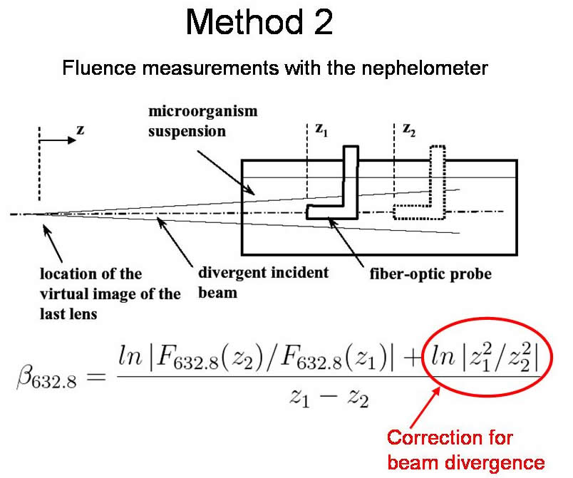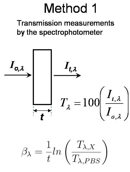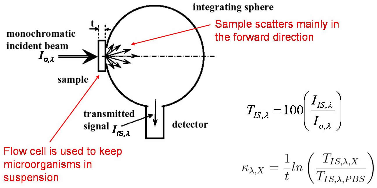 To be able to solve the RTE, one needs to experimentally or theoretically predict the radiation characteristics (or optical properties) of bacteria. Given the complex shape of the bacteria investigated and the fact that we do not know there index of refraction, it was chosen to experimentally measure the corresponding values of Aabs,l, Ssca,l, and Fl. |