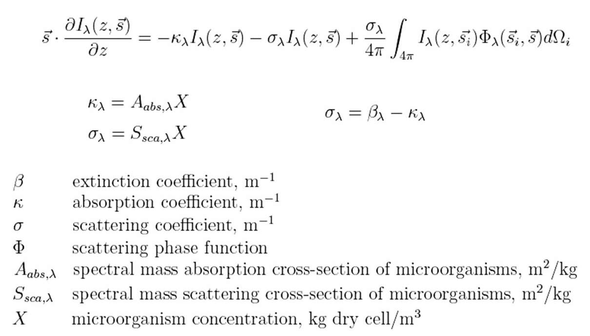 In order to simulate light transfer in photobioreactors used for hydrogen production and carbon dioxide mitigation one needs to solve the radiation transfer equation (RTE) given as,