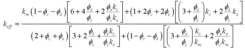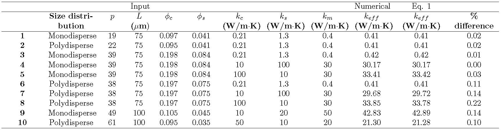 where n is the unit normal vector at any given point on the matrix/shell and shell/core interfaces, designated by subscript m/s and s/c, respectively. Results and Discussion Table 1 compares the numerically predicted effective thermal conductivity keff of ten composite microstructures to that predicted by the Felske model. Cases 1 and 2 indicate that the numerically predicted keff was the same for composites with monodisperse or polydisperse capsules for the same values of ϕc, &ϕs, kc, ks, and km. Table 1 also shows that keff predicted by the Felske model fell within 0.25% of numerical predictions for a wide range of constituent thermal conductivities kc, ks, and km and volume fractions ϕc and ϕs. Table 1. Numerical and analytical predictions of the effective thermal conductivity of composites consisting of monodisperse or polydisperse capsules randomly distributed in a continuous matrix. The average outer diameter and thickness of the shell are Ds,avg = 18 μm and ts = 1 μm. Figure 3 shows the effective thermal conductivity keff of a composite containing monodisperse capsules as a function of (a) the core volume fraction ϕc and (b) the shell volume fraction ϕs. The desired volume fractions were imposed by either adjusting the relevant diameter (Dc or Ds) while holding the unit cell length L constant or by adjusting the unit cell length L and holding the relevant diameter constant. Figures 3a and 3b establish that keff depended only on ϕc and ϕs and not on the individual geometric parameters Dc, Ds, and L.
