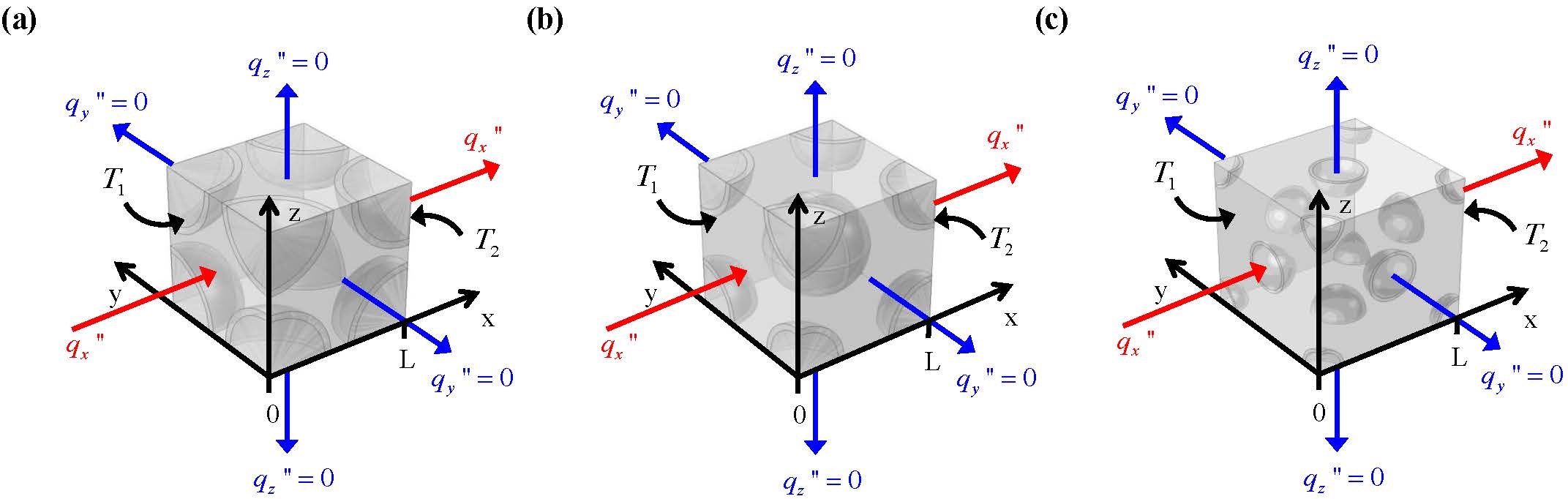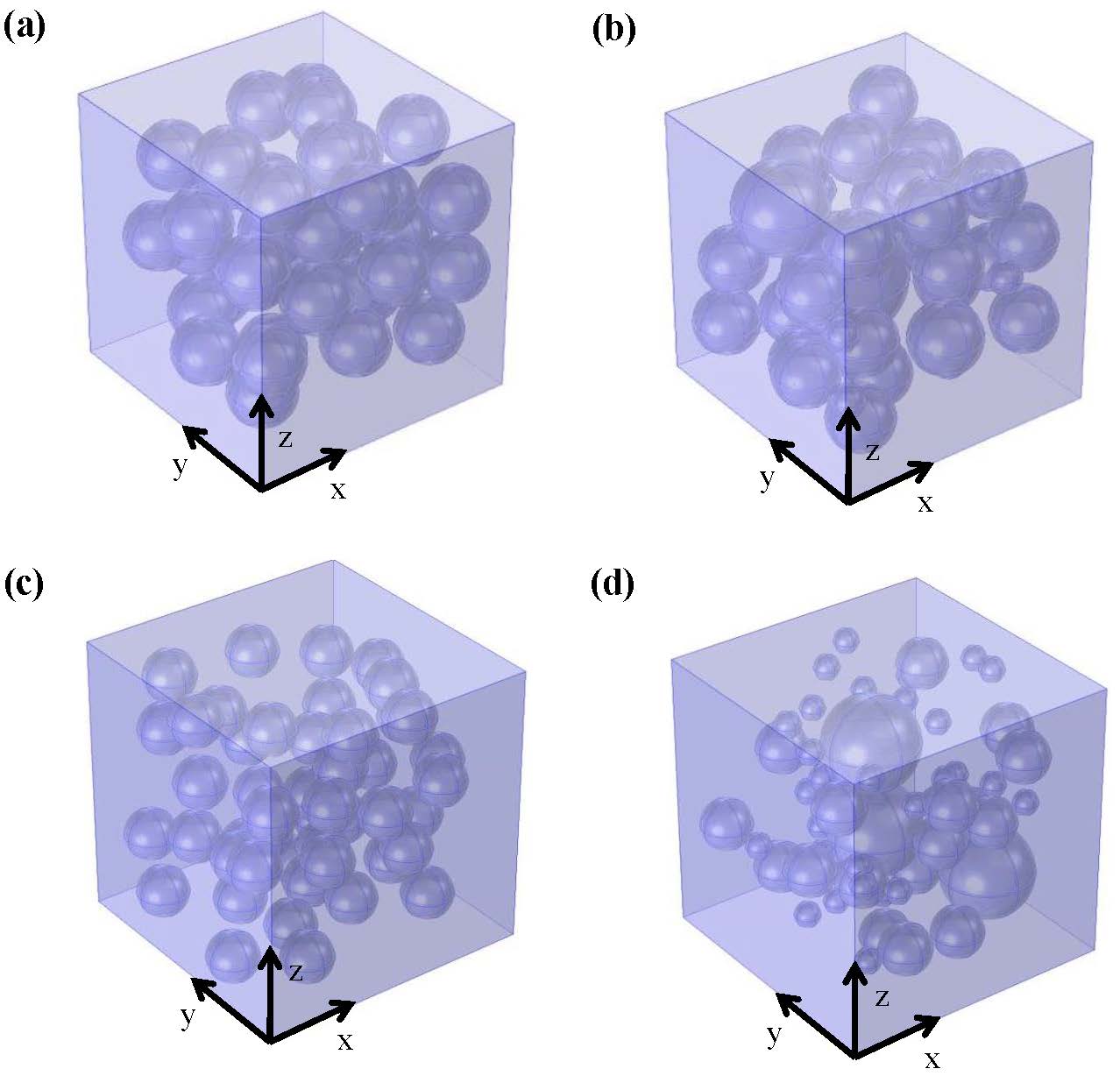 where kc, ks, and km are the thermal conductivities of the core, shell, and matrix materials, respectively. Similarly, ϕc, ϕs, and ϕm are the volume fractions of the core, shell, and matrix materials, respectively. Schematics and Assumptions The present study examined various composite representative volumes consisting of different packing arrangements of monodisperse and polydisperse spherical capsules distributed in a continuous matrix.