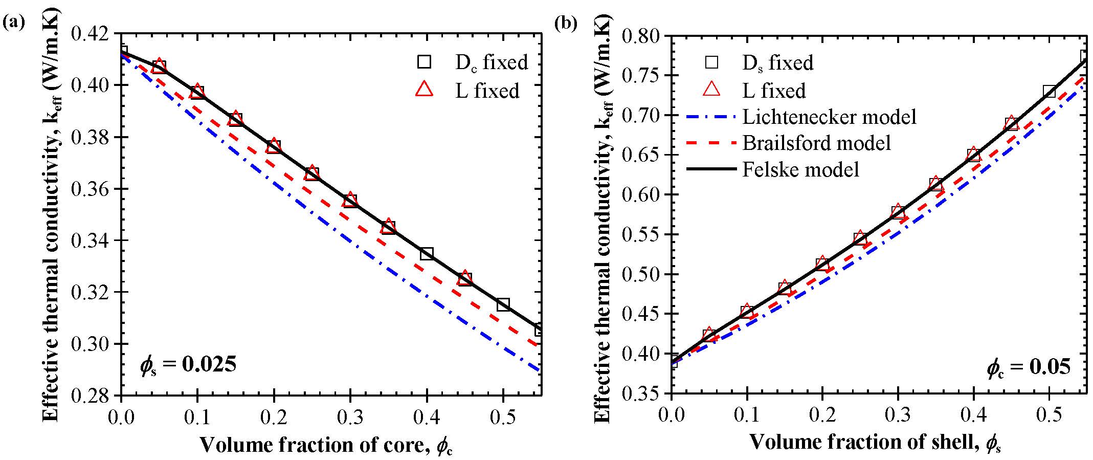 Figure 3. Effective thermal conductivity for (a) different values of ϕc with ϕs = 0.025 and (b) different values of ϕs with Φc = 0.05. The volume fractions were varied by adjusting either the diameter or unit cell length. Here, kc = 0.21 W/mK, ks = 1.3 W/mK, and km = 0.4 W/mK. Predictions by the Lichtenecker, Brailsford, and Felske models are also shown. Figure 4 plots the effective thermal conductivity keff of a composite material containing monodisperse capsules as a function of the thermal conductivity of the matrix km, core kc, and shell ks, respectively. Figure 4 shows that the Felske model predicted the effective thermal conductivity keff of composites containing monodisperse capsules within the estimated numerical uncertainty for all volume fractions considered and for a wide range of constituent material thermal conductivities.