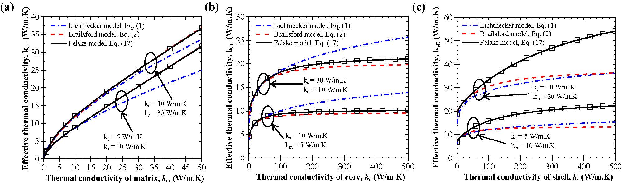 Figure 4. Effective thermal conductivity keff of core-shell composite as a function of the thermal conductivity of the (a) continuous km, (b) core kc, and (c) shell ks phase obtained numerically and predicted by the Lichtenecker, Brailsford, and Felske models. The volume fractions of core and shell were ϕc = 0.2 and Φs = 0.145. Conclusion This study established that the effective thermal conductivity was independent of the capsules' spatial distribution and size distribution. The effective thermal conductivity was found to depend solely on the core and shell volume fractions and on the core, shell, and matrix thermal conductivities. The Felske model predicted the effective thermal conductivity of the composite material within numerical uncertainty for the wide range of parameters considered. This model was used to identify conditions under which the effective thermal conductivity keff of the composite materials remained smaller than that of the matrix material. This thermal design rule will be useful in developing PCM-composite materials for energy efficient buildings. References
