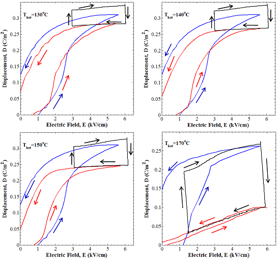 Figure 3. D–E curves and Olsen cycle performed at temperatures Tcold and Thot. Blue lines correspond to D–E curves at Tcold = 80ºC. Red lines correspond to D–E loops for Thot equal to 130, 140, 150 and 170ºC. Solid lines correspond to the Olsen cycles performed between 80ºC and Thot. The Olsen cycle is displaced to coincide with D–E curve at Thot. Effect of electric fields EL and EH Figure 4 shows four different Olsen cycles in the D–E diagram performed with EL = 0.0, 1.5, 2.0, and 3.0 kV/cm. The cycles are shown superimposed to facilitate their comparison. For the three cases when EL was equal to 1.5, 2.0, and 3.0 kV/cm, the material reached approximately the same electric displacement when the electric field was raised to EL at Tcold. The optimal value of EL was found to be 2.0 kV/cm with an energy density of 24.8 J/L/cycle. The energy density harvested when EL = 0 kV/cm was 0.5 J/L. This was due to crossover of the hot and cold D–E curves.