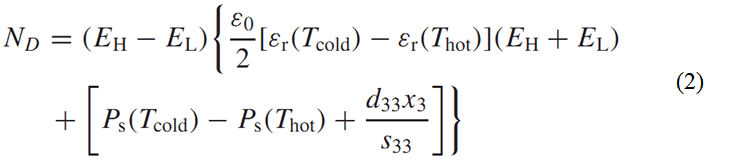 For an unclamped crystal, it consists of two terms, namely (i) the primary pyroelectric coefficient accounting for changes in crystal dipole moment and (ii) the secondary pyroelectric coefficient due to dimensional changes in the crystal both caused by changes in temperature. The result of integrating the energy density equation is The term d33x33/s33 accounts for the secondary pyroelectric effect which is due to thermal expansion. Here, x33 is the strain resulting from the thermal expansion, d33 is the piezoelectric coefficient and s33 is the elastic compliance. By assuming the properties do not depend on temperature, the former equation reduces to one given by Sebald et al.[1].