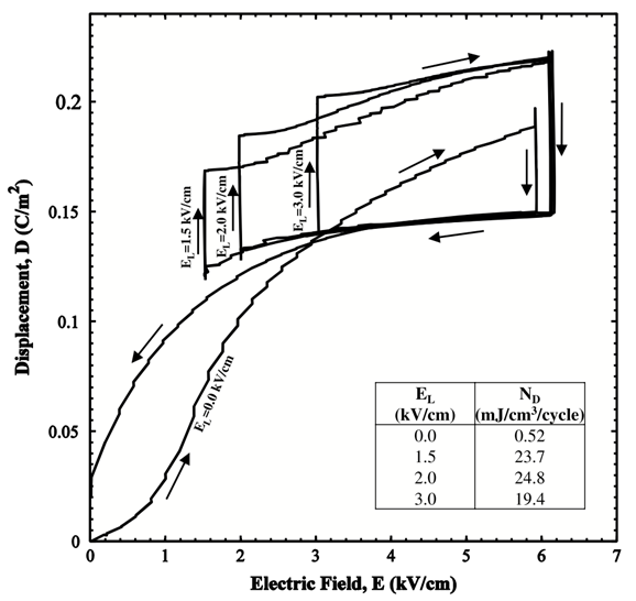 Figure 4. Experimental Olsen cycle diagrams performed on [001] poled PMN–32PT between Tcold = 80ºC and Thot = 140ºC for EH= 6 kV/cm and EL varying from 0 to 3.0 kV/cm. Conclusion This study presented experimental measurements of energy density generated by commercial PMN–32PT capacitors subjected to the Olsen cycle. A physical model was also derived to predict the energy density generated during the cycle. The maximum energy density harvested with PMN–32PT was found to be 100 J/L between temperatures Tcold = 80ºC and Thot = 170ºC and electric field spanning from 2.0 to 9.0 kV/cm. Future study should be performed to further validate the model and its applicability to different materials. References [1] Sebald G., Seveyrat L., Guyomar D., Lebrun L., Guiffard B., and Pruvost S., 2006. Electrocaloric and pyroelectric properties of 0.75Pb(Mg1/3Nb2/3)O3–0.25PbTiO3 single crystals. J. Appl. Phys., Vol. 100, pp. 124112. [2] Yasuda N., Banno T., Fujita K., Ohwa H., Matushita M, Yamashita Y., Iwata M., and Ishibashi Y., 2007. Piezoelectric properties of relaxor ferroelectric solid solution single crystals PMN–PT and PZN–PT near MPB under pressures, Ferroelectrics Vol. 347, pp. 44–49. [3] Li Z., Xu Z., Xi Z., Xiang F., and Yao X., 2007. Thermal expansion characteristics in [001]-oriented PMN–0.32PT single crystals, Ferroelectrics, Vol. 355, pp. 245–251. Publications R. Kandilian, A. Navid, and L. Pilon, 2011. Pyroelectric Energy Harvesting Capabilities of PMN-PT Near the Morphotropic Phase Boundary, Smart Materials and Structures, Vol. 20, No. 5, 055020. doi: 10.1088/0964-1726/20/5/055020. |