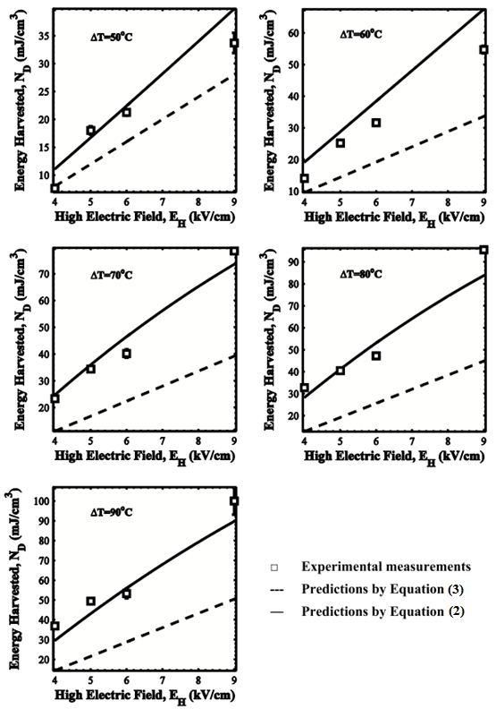 Experimental Results The electric field EL was fixed at 2.0 kV/cm and the cold temperature Tcold was maintained at 80ºC for all experiments. The largest amount of energy harvested from this sample was 100 J/L/cycle, corresponding to 4.92 mW/cm3, obtained between temperatures Tcold = 80ºC and Thot = 170ºC and electric fields EL=2 kV/cm and EH=9 kV/cm. Figure 2 compares the energy density obtained experimentally with of that predicted (i) by Equation (2) assuming constant properties and (ii) by Equation (3) accounting for temperature dependent properties. The constant-property model deteriorated as the temperature difference ΔT = Tcold − Tcold increased. The effects of thermal expansion were taken into account by the temperature-dependent-property model for Thot =130 and 140ºC. However, they were neglected for Thot=150ºC as the terms x33 and d33 are negligible [2]. Figure 2 shows that reasonable agreement was found between this model’s predictions and experimental data. In fact, the relative error was less than 20% for all values of temperatures and electric fields explored. In addition, the model presented here does not require knowledge of the pyroelectric coefficient in order to calculate the energy density generated by a ferroelectric material subjected to the Olsen cycle. However, this model does not simulate the hysteresis behavior and is valid in the region where the displacement depends linearly on the electric field. This is generally the case for the Olsen cycle and indeed was the case for the experiments performed on PMN–32PT with EL larger than 2.0 kV/cm.