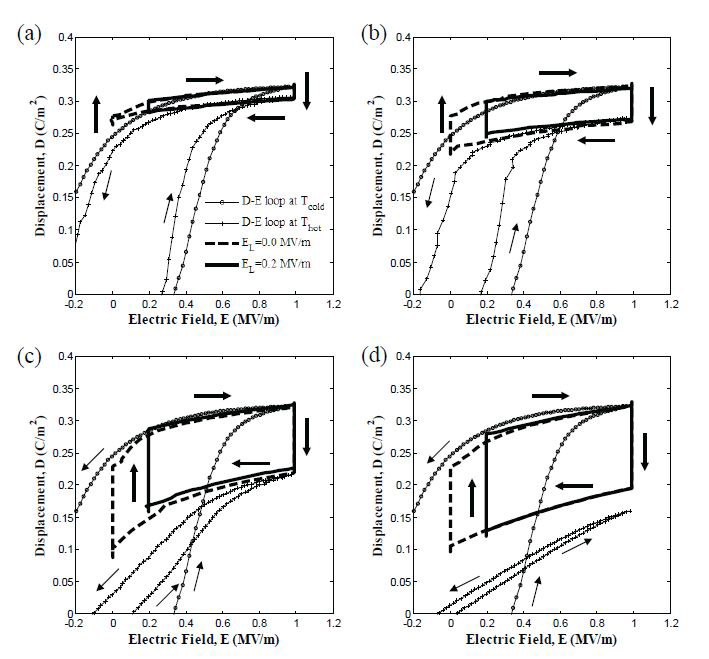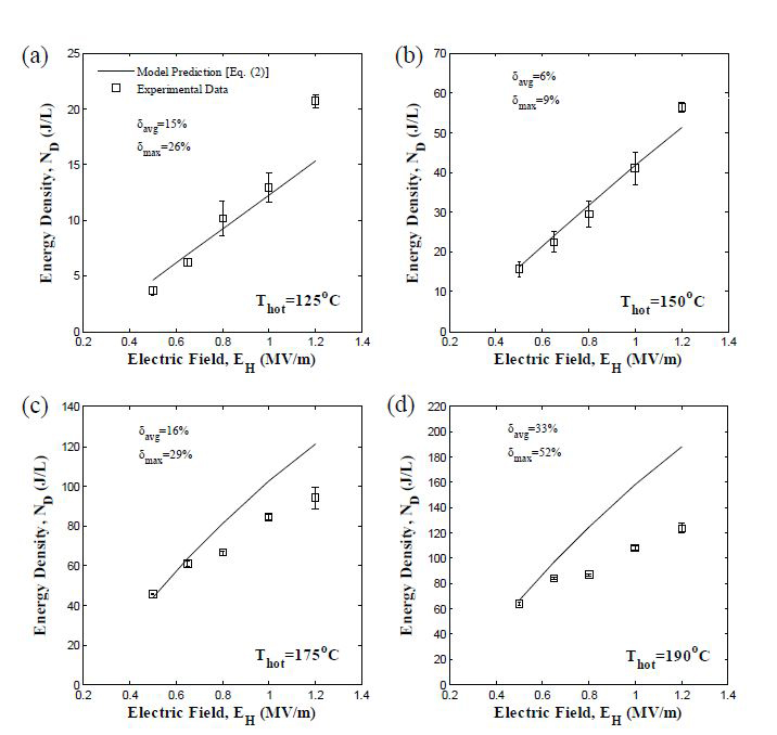 Model Predictions Figure 8 compares experimental energy density generated by Sample 5 with predictions of the model given by Equation (2). The saturation polarization and dielectric constant of Sample 5 at Tcold and Thot were retrieved from D-E loops. Here, the last term of Equation (2), corresponding to the contribution of thermal expansion to the energy density, was ignored. Indeed, the Olsen cycles performed on PZN-5.5PT fell on or within the bounds of the isothermal D-E loops at Tcold and Thot (Figure 2), indicating that thermal expansion did not contribute to the generated energy.