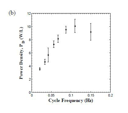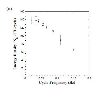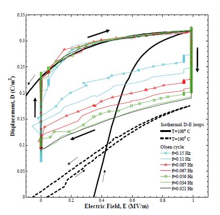 Experimental Results Isothermal bipolar displacement versus electric field hysteresis curves were collected at various temperatures by applying a triangular voltage with frequency of 0.1 Hz across the single crystal samples. Moreover, the saturation polarization Ps(T) and the dielectric constant εr(T) of each sample at temperature T were evaluated by linearly fitting the section of the bipolar D-E loops corresponding to relatively large electric field decreasing from 1 to 0.5 MV/m. The Olsen cycle was performed on the PZN-5.5PT samples for (i) different values of low and high electric fields EL and EH, (ii) various hot operating temperature Thot, and (iii) various cycle frequency f. The cold operating temperature Tcold was fixed at 100ºC. The hot operating temperature was varied from 125 to 190ºC. The electric fields EL and EH ranged from 0 to 0.2 MV/m and from 0.5 to 1.5 MV/m, respectively. Figure 2. Isothermal bipolar D-E loops and experimental Olsen cycles at EL=0.0 and 0.2 MV/m for PZN-5.5PT (Sample 5) with Tcold=100oC and EH=1.0 MV/m for Thot equal to (a) 125ºC, (b) 150ºC, (c) 175ºC, and (d) 190ºC. Effect of Frequency The overall cycle frequency was defined as f = 1/(.τ12 + τ23 + τ34 + τ41) where τ.ij corresponds to the duration of process i-j. It varied from 0.021 to 0.15 Hz by changing the duration of the isoelectric field heating and cooling processes 2-3 and 4-1 denoted by τ23 and τ41 (Figure 1). However, the time rate of change of the electric field during the isothermal processes 1-2 and 3-4 remained the same at 0.4 MV/m/s. First, it is interesting to note that the Olsen cycles measured at frequencies of 0.021 Hz and 0.034 Hz overlapped. Indeed, for these frequencies, the electric displacement had reached steadystate, i.e., ∂D/∂t = 0, before the electric field was varied. In this case, processes 1-2 and 3-4 followed a relatively smooth path, indicating that the four different processes in the Olsen cycle were performed under quasiequilibrium conditions. Figure 4. D-E diagram of isothermal bipolar D-E loops and experimental Olsen cycles at various frequencies for PZN-5.5PT (Sample 4). The temperatures Tcold and Thot were maintained at 100 and 190ºC, respectively and the low and high electric fields EL and EH were set at 0.0 and 1.0 MV/m, respectively The energy density reached a plateau of 140 J/L/cycle at frequencies below 0.034 Hz and decreased with increasing cycle frequency. Reducing the cycle frequency below 0.034 Hz, by increasing the duration of the isoelectric field processes 2-3 and 4-1, did not result in larger energy density because each process of the Olsen cycle was in quasiequilibrium. Conversely, the power density increased with increasing frequency and reached a maximum of 10.1 W/L at 0.1 Hz. For frequencies larger than 0.1 Hz, PD decreased with increasing frequency. This can be explained by considering the expression PD = ND(f)f. For frequencies less than 0.1 Hz, the decrease in ND(f) was compensated by the raise in frequency so that PD increased. However, beyond 0.1 Hz, ND decreased significantly with frequency resulting in smaller values of PD. In practice, the operating frequency could be adjusted according to the power needed for a given load. Figure 5. Experimentally measured (a) energy density and (b) power density generated with PZN-5.5PT single crystal (Sample 4) as a function of cycle frequency. The temperatures Tcold and Thot were maintained at 100 and 190ºC, respectively. The low and high electric fields EL and EH were set at 0.0 and 1.0 MV/m, respectively.