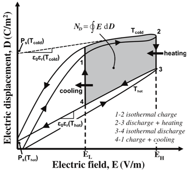 Figure 3. Electric displacement versus electric field for a typical pyroelectric material at different temperatures. The Olsen power cycle is represented by the area between 1-2-3-4. |