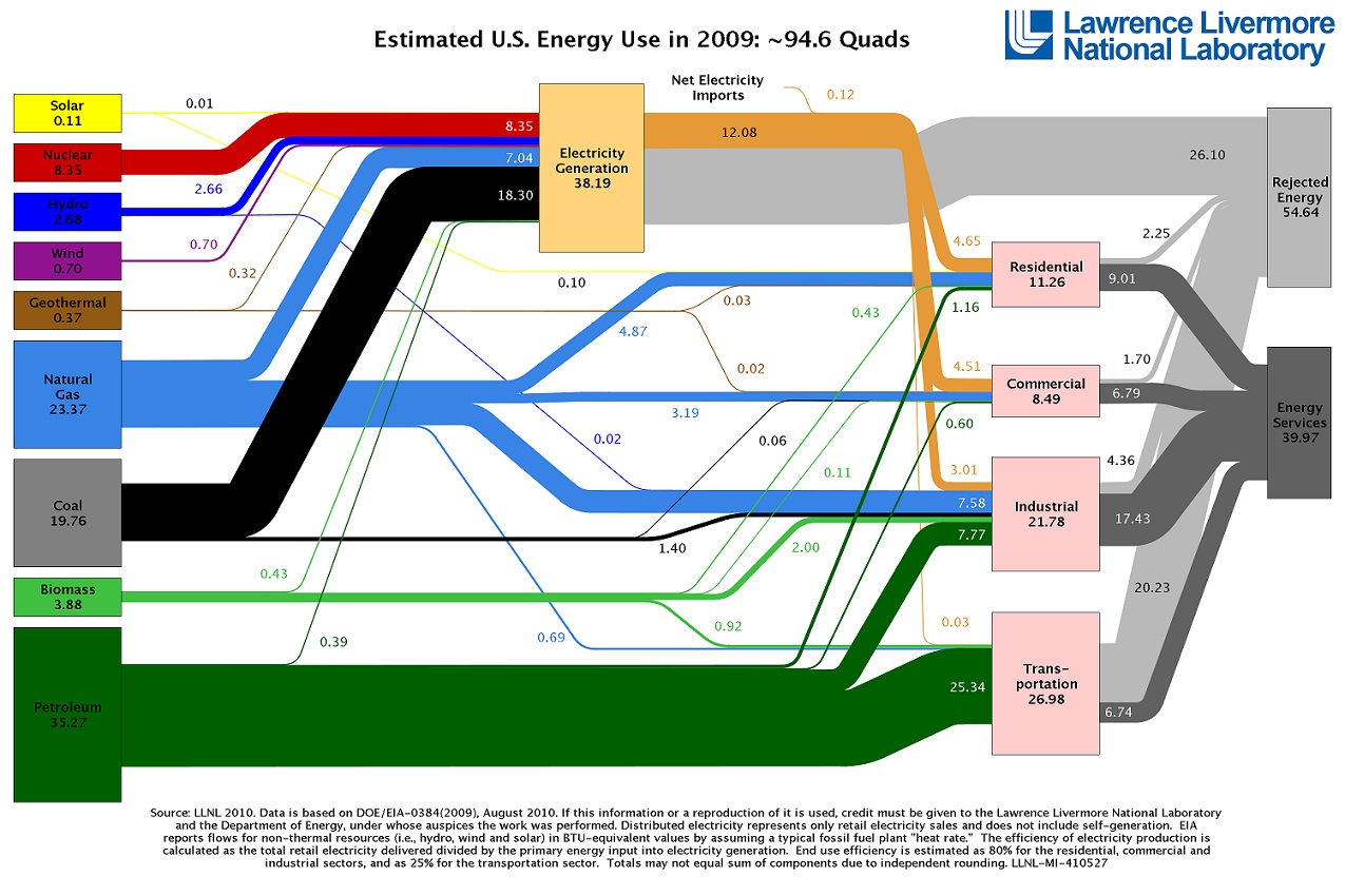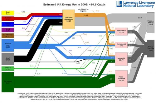 Figure 1. Flow chart of the energy produced, used, and wasted in the United States in 2009 (unit in quads) [1]. |