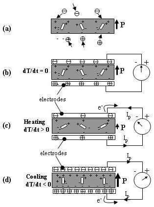 Figure 2. Schematic of a pyroelectric sample (a) by itself and with electrodes and connected to an ammeter (b) at constant temperature, (c) while being heated, and (d) while being cooled (adapted from Lang [2]). |