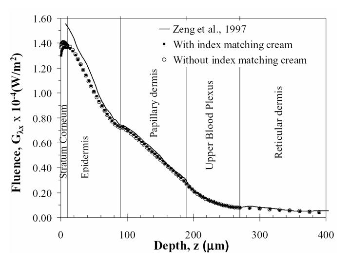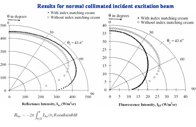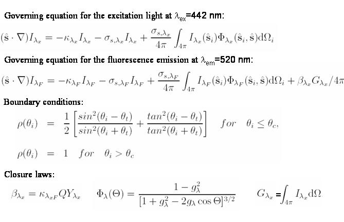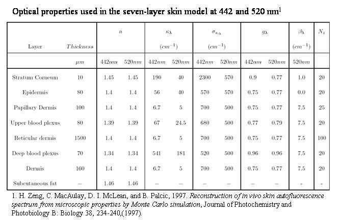 ![]() Zeng et al. (1997) proposed a seven layer optical model for solving steady-state autofluorescence of skin. The model includes the thickness and optical properties (κλ, σλ, c, and Φλ) of each layer of the skin for the excitation wavelength λex=442 nm and the autofluorescence wavelength of λem=520 nm. The above Figure compares our numerical results with those obtained by Zeng et al. (1997) using the Monte Carlo method to solve the above light transport Equations. Good agreement between the two methods (within 5% relative error) is observed. Note that the excitation light is completely attenuated at a depth of 0.6 mm within the skin. In addition, Zeng et al. (1997) compared their numerical results with in vivo measurements of steady-state autofluorescence of skin for Caucasian and Asian patients (Fig.7) thus, confirming the validity of the skin optical model and the simulation tool developed. Zeng, H. , MacAulay, C. , McLean, D. I. , and Palcic, B. , 1997. Reconstruction of in vivo skin autofluorescence spectrum from microscopic properties by Monte Carlo simulation, Journal of Photochemistry and Photobiology B: Biology, Vol. 38, pp.234-240. Steady-State Directional Reflectance and Fluorescence of Human Skin