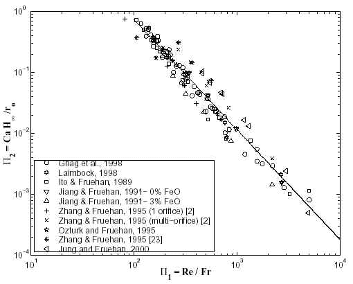 The model is valid for foams formed from high viscosity liquids bubbled with nitrogen, air, helium, hydrogen, and argon injected through single, multi-orifice nozzles or porous medium. Comparison between the correlation developed and the experimental data yields reasonable agreements (within 35% error), given the broadness of the bubble radius distribution around the mean value, the uncertainty of the experimental data and of the thermophysical properties. Predictions have been found to be very sensitive to the average bubble radius. A more refined model is still needed which should be supported by a careful experimental studies. Finally, suggestions are given to extend the present work to foams generated from low viscosity solutions. Publications D. Lotun and L. Pilon, 2005. Physical Modeling of Slag Foaming For Various Operating Conditions and Slag Compositions. ISIJ International, Vol. 45, No.6, pp. 835-840. L. Pilon, A. G. Fedorov, and R. Viskanta, 2001. Steady-State Thickness of Liquid-Gas Foams. Journal of Colloid and Interface Science, Vol. 242, No. 2, pp. 425-436. doi:10.1006/jcis.2001.7802. |