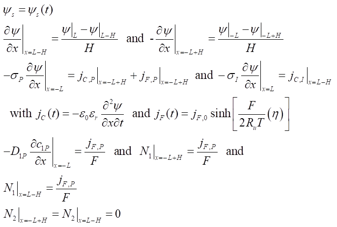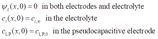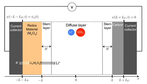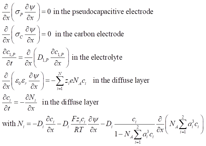 Governing equations The local electric potential ψ(x,t) in the pseudocapacitive (subscript P) and carbon (subscript C) electrodes and the ion concentrations ci(x,t) in the electrolyte and electrode are governed by the one-dimensional Modified Poisson-Nernst-Plank model expressed as