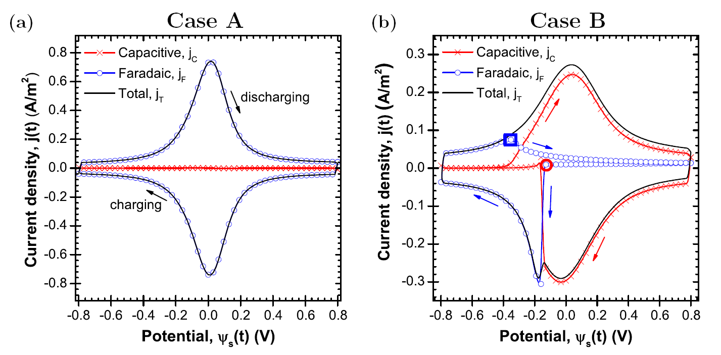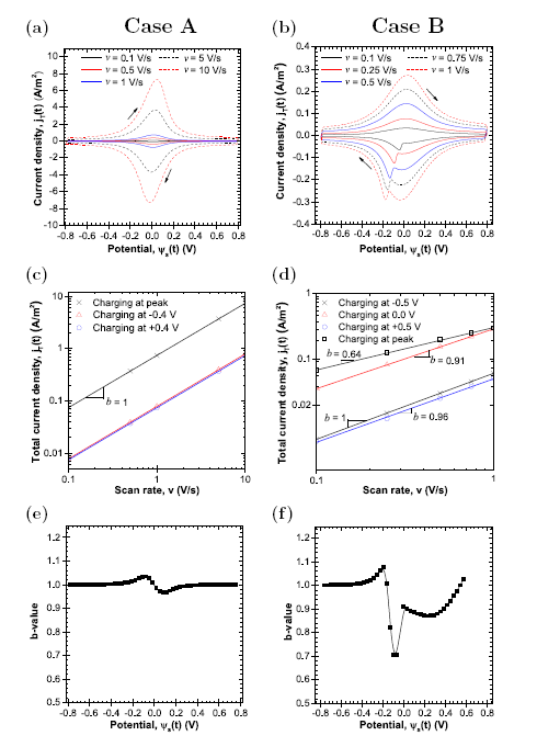 Figure 1a indicates that the CV curve jT vs. ψs featured a peak in both charging, for decreasing ψs, and discharging, for increasing ψs, currents around ψs = 0 V. Figure 1a also shows that the faradaic current dominated during the entire cycle and the capacitive current was negligible. This can be attributed to fast redox reactions and intercalation of Li atoms in the thin electrode. Indeed, the large reaction rate guaranteed that Li+ ions at the Stern/diffuse layer interface were consumed by the redox reaction during charging. In addition, the large diffusion coefficient of Li+ ions in the electrolyte ensured sufficient supply of Li+ during charging. Similarly, the large diffusion coefficient of Li+ in the pseudocapacitive electrode ensured sufficient supply of Li atoms to be oxidized at the electrode/electrolyte interface during discharging. Then, no significant capacitive current resulting from EDL formation was observed. In contrast to Case A (Figure 1a), Figure 1b shows that, for slow Li+ diffusion in a thick electrode, the faradaic current jF dominated only in the lower end of the potential window while the capacitive current jC dominated in the higher end during both charging and discharging. In addition, the total current jT and the integral capacitance were smaller in Case B than in Case A for the same v = 1 V/s. In Case B, the CV curve featured three peaks in the total current: at ψs = 0 V in both the charging and the discharging phase, and at ψs = -0.15 V in the charging phase. Fig. 1. Capacitive jC, faradaic jF, and total jT current densities versus cell potential for a scan rate v = 1 V/s for (a) Case A and (b) Case B. Fig. 2a indicates that, in the case of a thin electrode with fast intercalation (Case A), the CV curves were similar in shape with the total current density jT(ψs) increasing with scan rate. This suggests that the cell was not limited by diffusion of any species for the range of scan rates considered. Fig. 2b shows that, the peaks and humps apparent during charging shifted to lower potential ψs as the scan rate v increased. Note that this was consistent with experimental observations of Li+ insertion in nanocrystalline films of orthorhombic Nb2O5 [3] or in TiO2 anatase [4]. Fig. 2c shows that, for Case A, the total current jT increased linearly with scan rate v for ψs = -0.4 V and +0.4 V. The same observation was made for all potentials across the potential window including the current at the charging peak, also known as cathodic peak. On the other hand, Fig. 2d indicates that, for Case B, the evolution of the total current density jT(t) with the scan rate v depended on the potential considered. Fig. 2e indicates that for Case A, the b-value was independent of ψs and close to unity across the potential window. Note that the faradaic current with fast intercalation dominated for all potentials (Fig. 2a). Thus, these results indicate that a b-value of unity can be associated with fast reversible faradaic reaction in thin electrodes. Then, the faradaic current jF was proportional to the scan rate v, as also observed in EDLCs. Thus, this behavior can be referred to as "capacitive behavior". However, the charge storage mechanism is truly faradaic and not capacitive. By contrast, for Case B, Fig. 1f indicates that the b-value featured a drop from 1 to about 0.6, as often observed in experimental studies of pseudocapacitors [2,4,5]. The dip in the b-value has often been attributed to the intercalation process on the basis that jT was proportional to v1/2 for reversible redox reactions with semi-infinite diffusion of the reaction products and in the absence of electric double layers [6]. However, the dip in the b-value predicted numerically did not occur during the faradaic regime but for -0.2 V < ψs < 0 V corresponding to the transition between the capacitive and faradaic regimes. Fig. 2. CV curves for multiple scan rates for (a) Case A and (b) Case B. Total current density jT as a function of scan rate v in log scale for a selection of imposed potentials ψs(t) for (c) Case A and (d) Case B. Computed b-value as a function of imposed potential for (e) Case A and (f) Case B using the charging current for all scan rates shown in (a) and (b) respectively. The regression coefficient R2 obtained in the fitting of the b-value was larger than 0.95 for all values of ψs. Conclusions