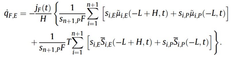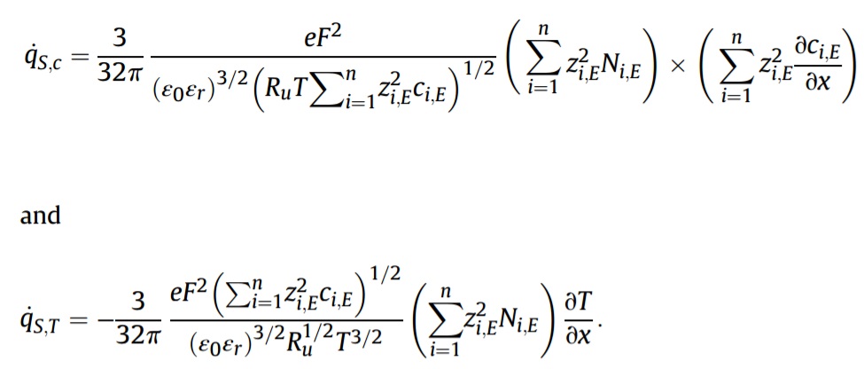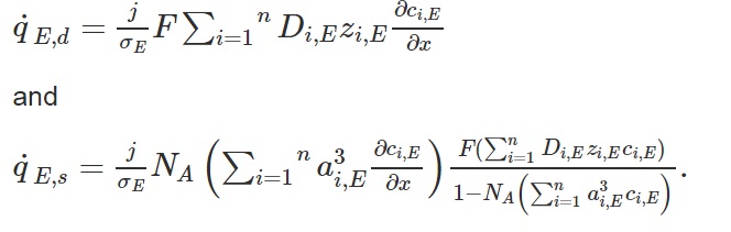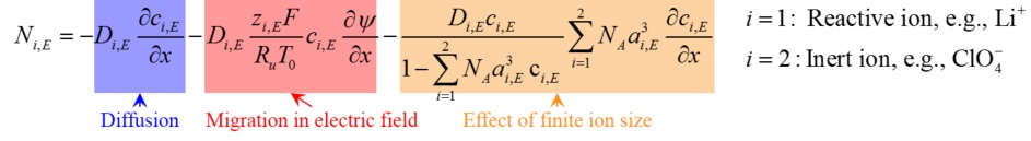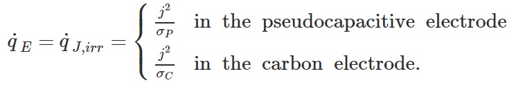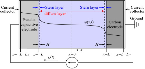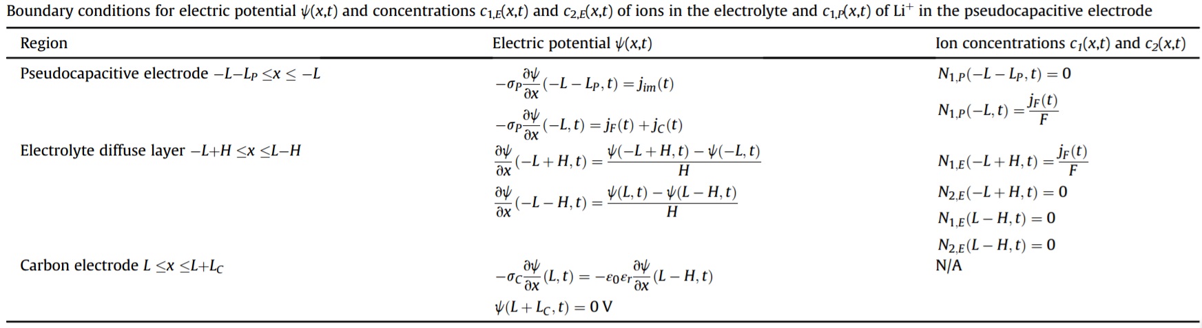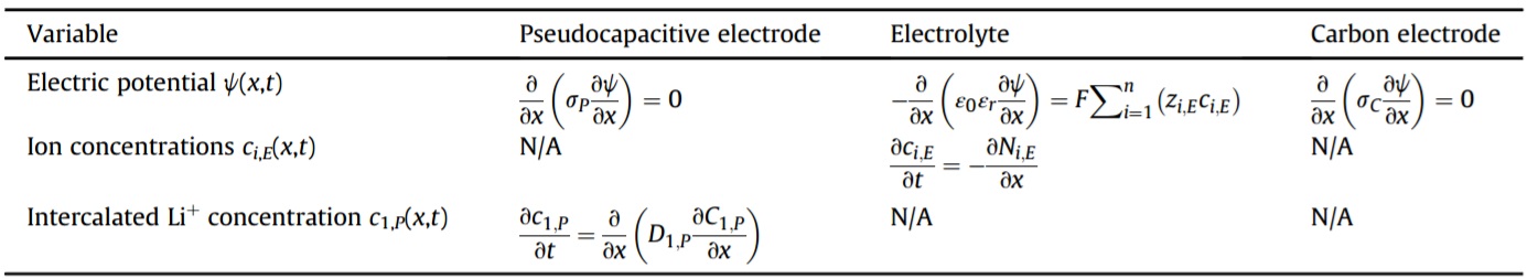 Governing equations One-dimensional governing equations for electric potential ψ(x,t), ion concentrations ci,E(x,t), and reduced Li+ concentration c1,P(x,t) in the pseudocapacitive and carbon electrodes and in the electrolyte: