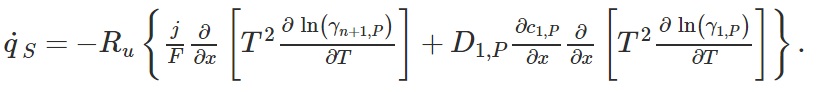 Results Numerically predicted total heat generation rates (a) Q̇P of the pseudocapacitive electrode half-cell and (b) Q"̇C of the carbon electrode half-cell for 0 V ≤ ψs ≤ 0.45 V as well as experimentally measured total heat generation rates minus Joule heating (c) Q̇C-Q̇j,irr,P of the pseudocapacitive electrode half-cell and (d) of the carbon electrode half-cell for a hybrid pseudocapacitor cycled galvanostatically over the potential window 0 V ≤ ψs ≤ 1.0 V [1] as functions of dimensionless time t/tc for different values of js. Conclusions The present study developed the first thermal model based on first principles for the local irreversible and reversible heat generation rates and temperature of EDLCs with multiple ion species and/or asymmetric electrolytes. Detailed numerical simulations were performed for different binary and asymmetric electrolytes based on the properties of aqueous H2SO4. First, the irreversible heat generation rate q̇irr was uniform across the electrolyte and equal to q̇irr =js2/σ∞. It decreased with increasing valency |zi| or diffusion coefficient Di of one or both ion species due to the resulting increase in electrical conductivity of the electrolyte. However, q̇irr was independent of the ion diameter ai. The reversible heat generation rate q̇irr near each electrode was governed by the properties of the counterion. It increased with increasing valency |zi| and decreasing ion diameter ai but was independent of diffusion coefficient Di. As a result, electrolytes with asymmetric valency zi or ion diameter ai featured spatially asymmetric heat generation rates and larger temperature oscillations near the electrode with the larger |zi| or smaller ai of the counterion. The results demonstrate that thermal models must account for electrolyte asymmetry in order to accurately predict the local heat generation rates and temperature. This study suggests that to reduce the overall heat generation in EDLCs, electrolytes should feature large bulk concentrations ci,∞ and at least one ion species with large diffusion coefficient. In addition, electrolytes chosen to yield large capacitance via ions with large valency |zi| and/or small diameter ai are likely to feature large reversible heat generation rates generated near the electrode surfaces. References [1] J. Schiffer, D. Linzen, D.U. Sauer, Journal of Power Sources 160 (2006) 765-772. Publications A.L. d'Entremont and L. Pilon, 2014. First Principles Thermal Modeling of Electric Double Layer Capacitors Under Constant-Current Cycling. Journal of Power Sources, Vol. 246, pp. 887- 898. doi:10.1016/j.jpowsour.2013.08.024 pdf A.L. d’Entremont and L. Pilon, 2014. Scaling Laws For Heat Generation and Temperature Oscillations in EDLCs Under Galvanostatic Cycling. International Journal of Heat and Mass Transfer, Vol. 75, pp. 637–649. doi: 10.1016/j.ijheatmasstransfer.2014.04.001 pdf A.L. d’Entremont, and L. Pilon, 2014. First-Order Thermal Model of Commercial EDLCs. Applied Thermal Engineering, Vol. 67, pp. 439-446. doi: 10.1016/j.applthermaleng.2014.03.061 pdf A.L. d’Entremont and L. Pilon, 2015. Thermal Effects of Asymmetric Electrolytes in Electric Double Layer Capacitors. Journal of Power Sources, Vol. 273, pp. 196-209. doi. 10.1016/j.jpowsour.2014.09.080 pdf |