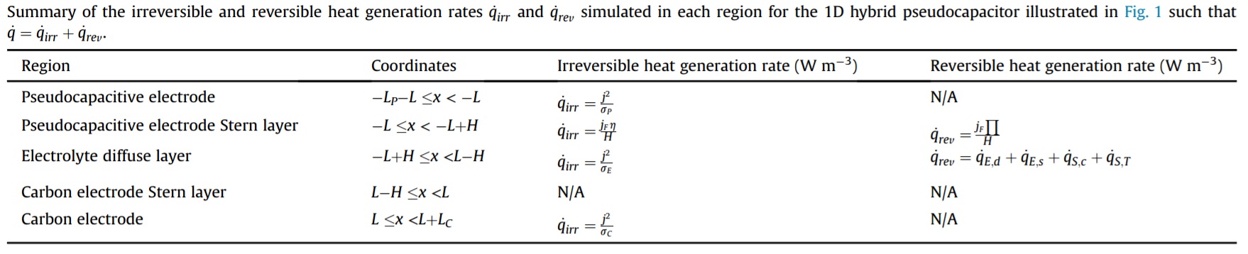 Abstract This study presents a theoretical framework developed from first principles for predicting the spatiotemporal thermal behavior of hybrid pseudocapacitors under galvanostatic cycling. It accounts for irreversible and reversible heat generation in the electrolyte and in the electrodes due to Joule heating, electric double layer (EDL) formation, and redox reactions. Detailed numerical simulations were performed to investigate the different local heat generation rates and the temperature as functions of time and cycling current. Numerical predictions showed good qualitative agreement with the limited experimental data available in the literature. Such numerical simulations can be used to physically interpret experimental measurements. Indeed, the present results suggest that a distinctive endothermic peak observed in the experimental heat generation rate resulted from cation starvation in the electrolyte reducing the faradaic current density. In addition, heating due to EDL formation significantly affected the local temperature and must be accounted for. The thermal model and the present results will help define safe modes of operation and develop thermal management strategies for pseudocapacitors. Highlights