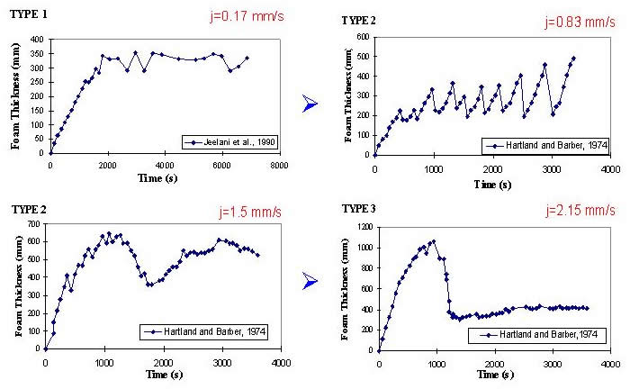 Analysis of Transient Foam Thickness Based on experimental observations, three different regimes in the transient growth of the foam can be identified as a function of the superficial gas velocity.