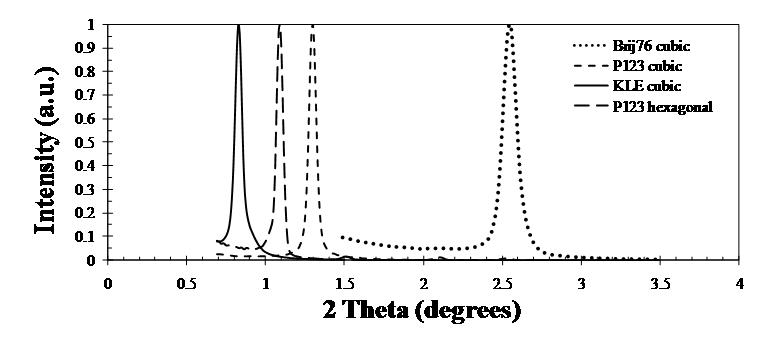 Normalized 1D-X-Ray Diffraction (XRD) intensity measurements for mesoporous silica thin films synthesized with Brij76 (cubic), P123 (cubic and hexagonal) and KLE (cubic). |