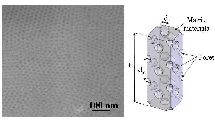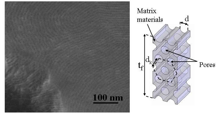 This project aims at investigating the possibility of tuning the optical and thermal properties of dense material by introducing nanometric pores. The pores can have various shapes, sizes, and spatial arrangements resulting in a wide range of porosity. Applications range from solar cells, optoelectronics, to membrane sciences to optical data storage, photocatalysts, and low-k dielectric materials. In all these applications, optical and/or thermal properties are essential to design devices and use the novel materials. The mesoporous thin films were synthesized by Prof. Sarah Tolbert's group at UCLA Chemistry and Biochemistry Department. |