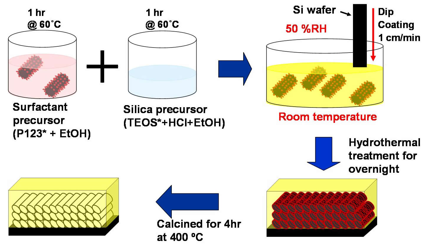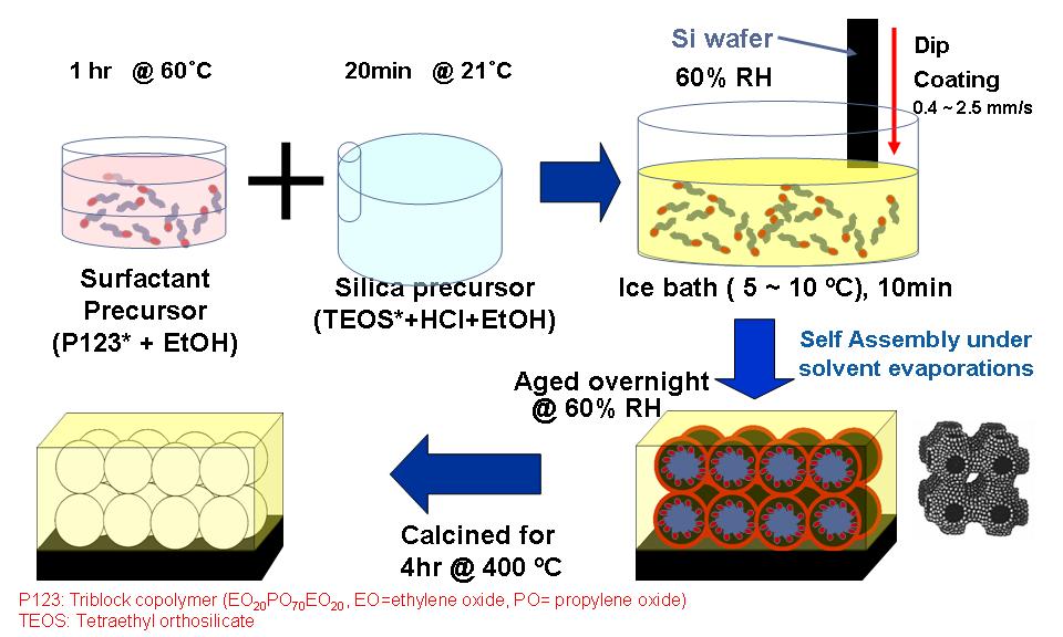 Synthesis recipes of mesoporous silicon dioxide thin films by evaporation induced self-assembly (EISA) of surfactant micelles in silica precursor |