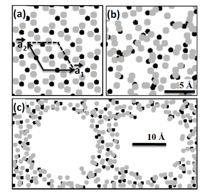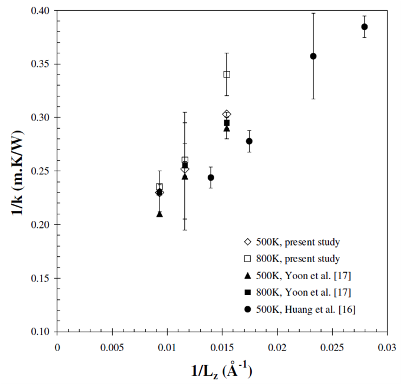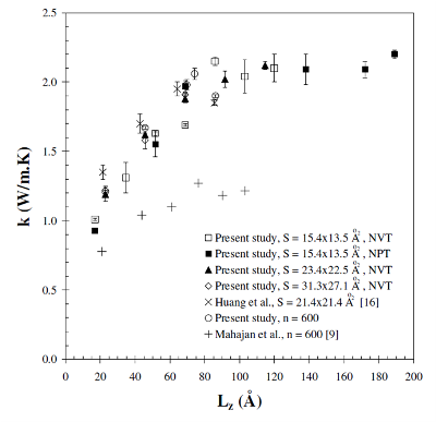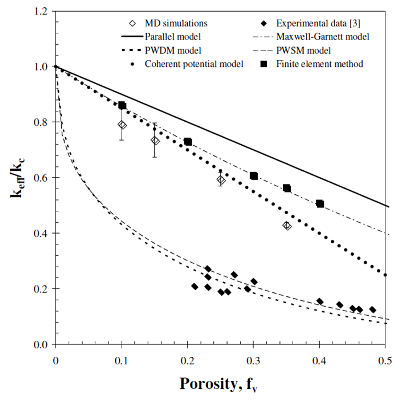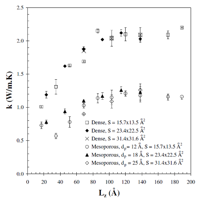 Conclusion The predicted thermal conductivity of nanoporous silica were independent of the cross-section of the simulation cell and of the ensemble used to generate the amorphous silica phase. The thermal conductivity was also independent of the system length Lz when the latter was larger than 11 nm, for both non-porous and nanoporous silica. The thermal conductivity of nanoporous silica was also found to be independent of pore diameter and depended only on porosity. It is worth noticing that the same results were observed experimentally for highly-ordered cubic and hexagonal mesoporous silica. Then, nanoporous silica can be treated as a continuous homogeneous medium with some effective thermal conductivity. The thermal conductivity predicted by MD simulations was in good agreement with the coherent potential model. On the other hand, predictions by finite element analysis based on continuum theory agreed with the well-known Maxwell Garnett model. Differences between MD simulation predictions and experimental data could possibly be attributed to the presence of "necks" connecting the pores in actual amorphous sol-gel mesoporous silica and ignored in the MD simulations. References T. Coquil, J. Fang, and L. Pilon, 2011. Molecular Dynamic Study of Thermal Conductivity of Amorphous Nanoporous Silica. International Journal of Heat and Mass Transfer, Vol. 54, pp. 4540–4548. doi:10.1016/j.ijheatmasstransfer.2011.06.024 T. Coquil, E. Richman, N. Hutchinson, S. Tolbert, and L. Pilon, 2009. Thermal Conductivity of Cubic and Hexagonal Mesoporous Silica Thin Films, Journal of Applied Physics, Vol. 106, no.3, 034910. Selected to appear in Virtual Journal of Nanoscale Science & Technology, Vol. 20, no.8, August 24, 2009. doi:10.1063/1.3182826 |