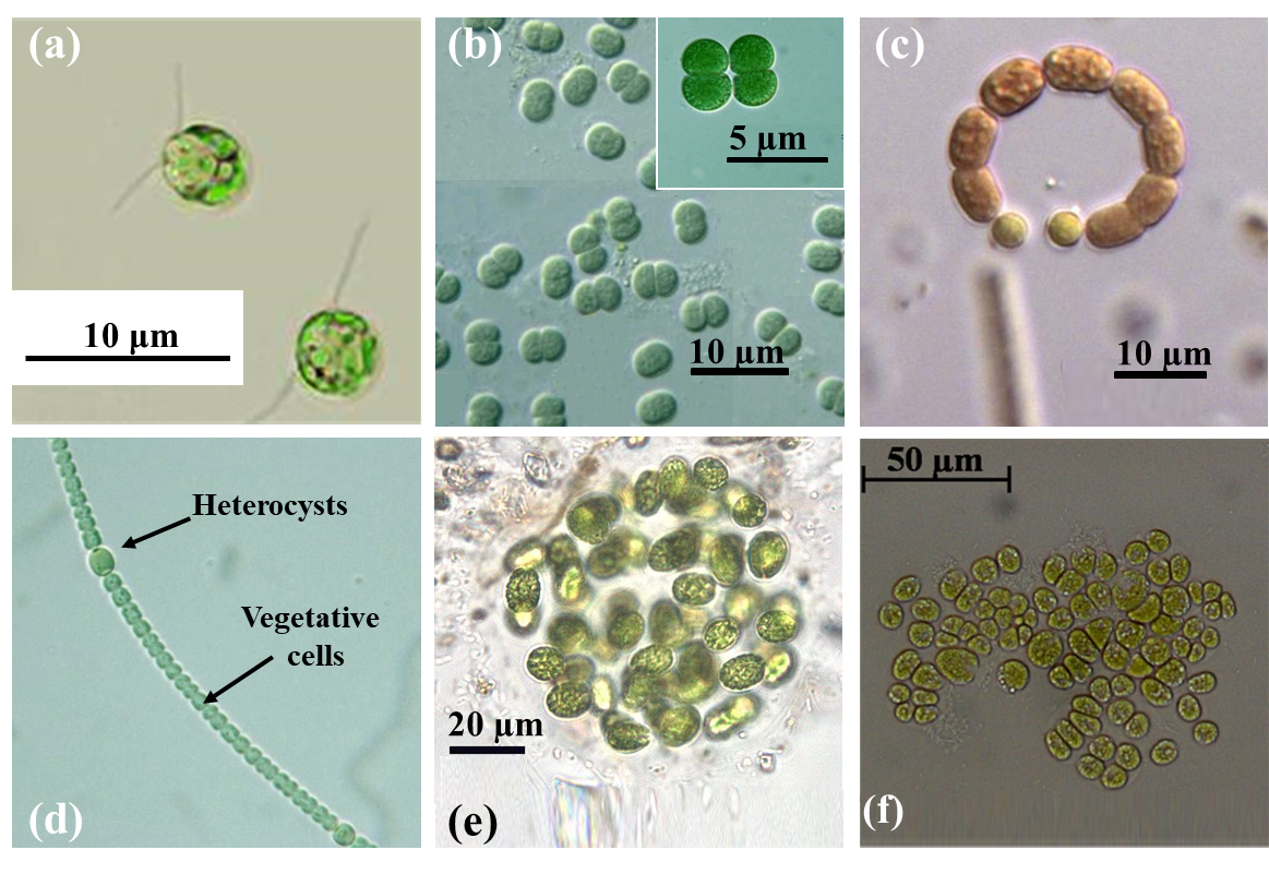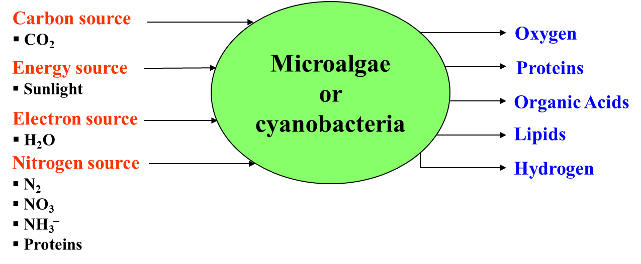 Microbiology Microalgae and cyanobacteria are photosynthetic microorganisms that use (i) sun as their energy source, (ii) CO2 as their carbon source, (iii) water as their electron source, and (iv) nitrates or N2 as their nitrogen source to produce oxygen, organic acids, proteins (for food supplements), lipids (for biodiesel), and H2 gas (to power fuel cells), under certain conditions.