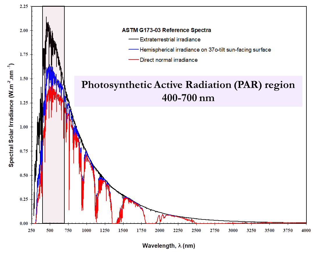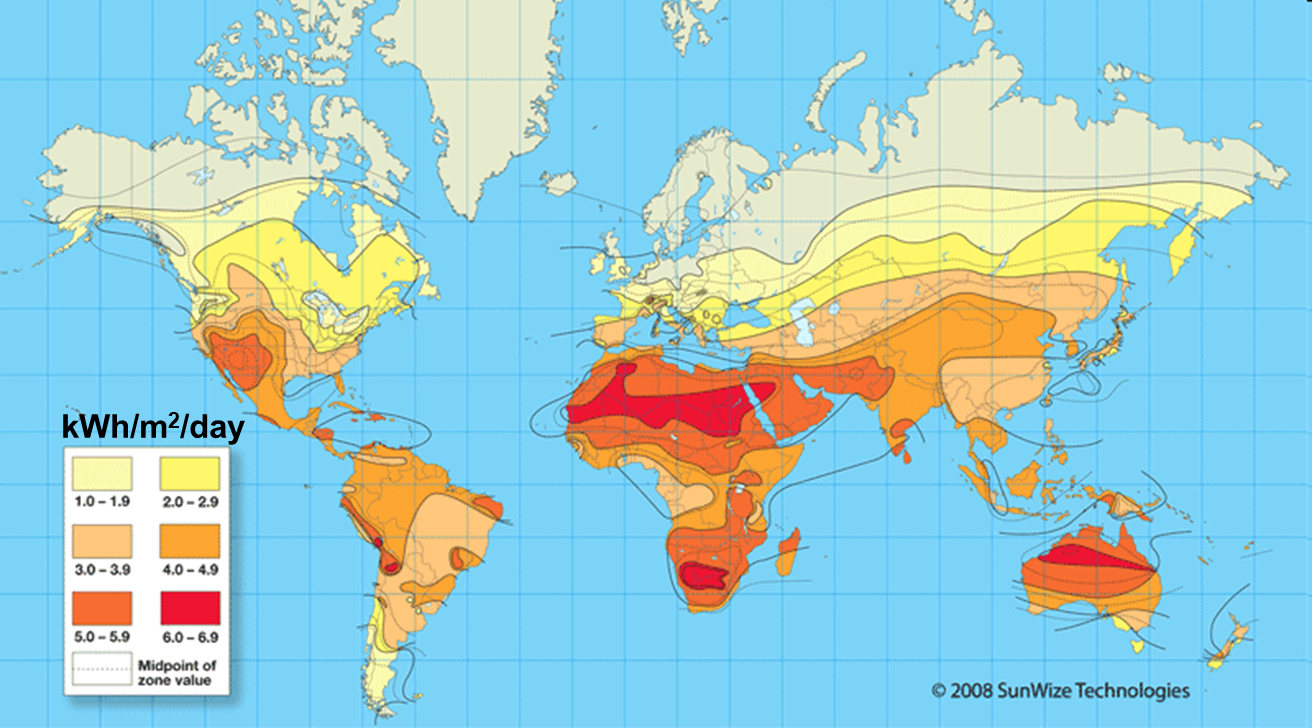 Figure 1 Micrographs of (A) Chlamydomonas reinhardtii, (B) dumbell-shaped Synechocystis sp. cell free floating and immediately after cell division (inset), (C) Anabaenopsis sp., (D) Anabaena cylindrica, (E) a colony of the microalgae B. braunii, and (F) Pleodorina californica. Panels (B–D) and (F) are reproduced with permission from Prof. Yuuji Tsukii, Hosei University (http://protist.i.hosei.ac.jp/). Solar radiation Solar radiation is the most abundant and renewable energy source on Earth. Through photosynthesis, it has provided human beings with food, fuel, heat, and even fossil fuels. The sun is often approximated as a blackbody at 5800 K emitting according to Planck’s law. Fig. 3 shows (1) the extraterrestrial spectral irradiance [2], (2) the direct normal spectral irradiance at sea level with an air mass of 1.5, and (3) the hemispherical (or global) spectral irradiance on an inclined plane at sea level, tilted at 37° toward the equator and facing the sun. Absorption due to atmospheric O3, O2, CO2, and H2O is apparent in the direct normal irradiance. Fig. 4 shows the amount of daily solar irradiance in hours incident on an optimally tilted surface during the worst month of the year based on worldwide solar insolation data [3]. The most promising regions for harvesting solar energy are the southwest United States and northern Mexico, the Andes, northern and southern Africa and the Middle East, as well as Australia. Other regions with favorable conditions include southern Europe, southern China, Southeast Asia, Brazil, and most of Africa. Note that many of these regions have limited freshwater resources, and microorganisms should be selected accordingly. Selection criteria to minimize water use include tolerance to wastewater or seawater and to high microorganism concentrations.