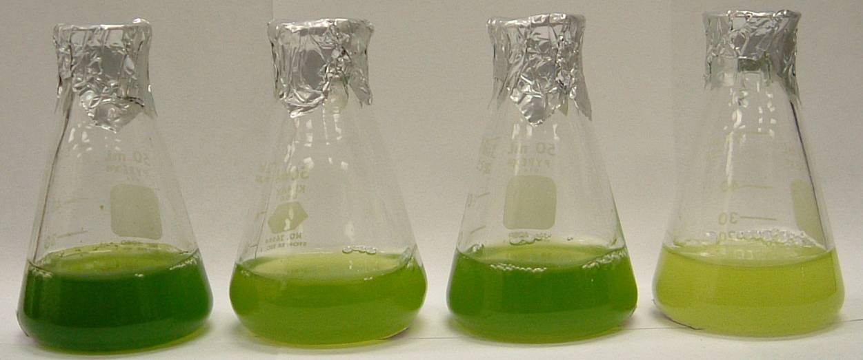 left to right: flasks containing the same concentration of Chlamydomonas reinhardtii (i) wild strain CC 125 and mutants* (ii) tla1, (iii) 37RP1-tla1, (iv) tlaX.