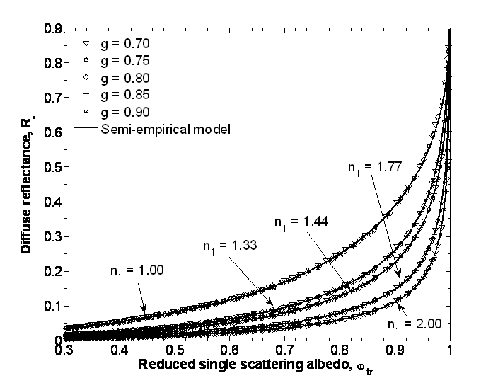 Simple analytical expressions for the diffuse reflectance of the semi-infinite and two-layer media considered were first derived using the two flux approximation. Then, parameters appearing in the analytical expression previously derived were instead fitted to match results from more accurate Monte Carlo simulations. A single semiempirical parameter was sufficient to relate the diffuse reflectance to the radiative properties and thickness of the semiinfinite and two-layer media. All media were assumed to be nonemitting, strongly forward scattering. The incident light source was a collimated, monochromatic, and normally incident beam of infinite radius. |