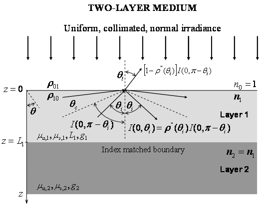 A two-layer medium was considered. It consisted of a plane-parallel slab (Layer 1) characterized by μa,1, μs,1, g1, n1 and thickness L1 supported by a semi-infinite sub-layer (Layer 2) characterized by μa,2 and μs,2, and μg,2. The thickness of Layer 1 was considered between 0 and infinity. The transport single scattering albedo of the slab μs,1(1-g1)/[μa,1 + μs,1 (1-g1)] and of the sub-layer μs,2(1-g2)/[μa,2 + μs,2 (1-g2)] varied between 0.50 and 0.99 which covers a wide range of biological tissues such as skin. |