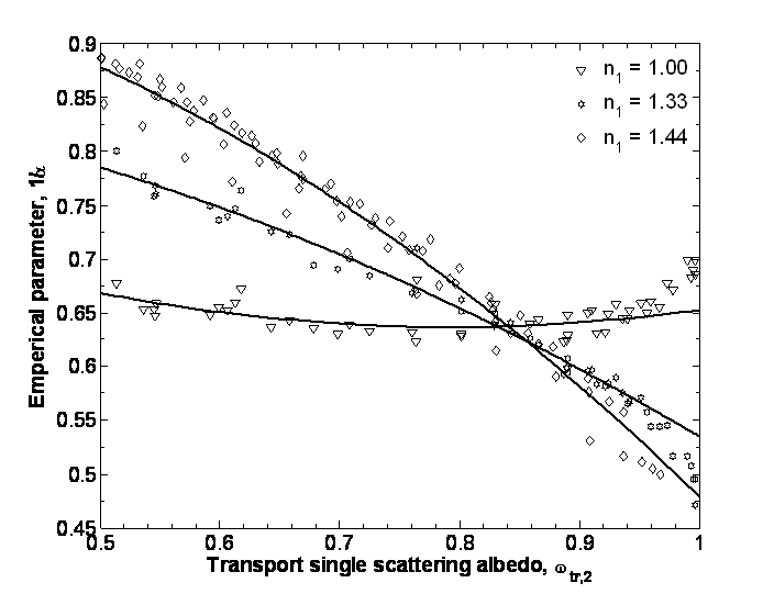 First, a homogeneous semi-infinite slab characterized by μa, μs, g, and n1 was considered. A wide range of property values was explored namely 0.3 < μs(1-g)/[μa + μs(1-g)] < 0.99, 0.70 < g < 0.90, and n1 =1.00, 1.33, 1.44, 1.77, and 2.00. |
