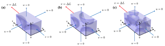 Figure 1. Schematics of core-shell particles with an (a) SC, (b) BCC, and (c) FCC packing arrangement, and the associated Cartesian coordinate system. Five of six faces are fixed, and a uniform normal displacement is applied to the final face.