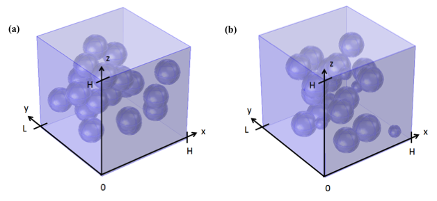The effective Young’s modulus and Poisson’s ratio of spherical monodisperse and polydisperse core-shell particles ordered or randomly distributed in a continuous matrix were predicted using detailed three-dimensional numerical simulations of elastic deformation. The effective elastic moduli of body-centered cubic (BCC) and face-centered cubic (FCC) packing arrangements of monodisperse microcapsules and those of randomly distributed monodisperse or polydisperse microcapsules were identical. The numerical results were also compared with predictions of various effective medium approximations (EMAs) proposed in the literature. The upper bound of the EMA developed by Qiu and Weng (1991) was in good agreement with the numerically predicted effective Young's modulus for BCC and FCC packings and for randomly distributed microcapsules. The EMA developed by Hobbs (1971) could also be used to estimate the effective Young's modulus when the shell Young's modulus was similar to that of the matrix. The EMA developed by Garboczi and Berryman (2001) could predict the effective Poisson’s ratio, as well as the effective Young's modulus when the Young's modulus of the core was smaller than that of the matrix. These results can find applications in the design of self-healing polymers, composite concrete, and building materials with microencapsulated phase change materials, for example. Schematics and Assumptions The deformation of composite materials consisting of a (i) matrix containing monodisperse spherical microcapsules with simple cubic (SC), body-centered cubic (BCC), or face-centered cubic (FCC) packing arrangements and of (ii) monodisperse and polydisperse microcapsules randomly distributed throughout the matrix was simulated numerically. Figure 1 shows a quarter of a simulated unit cell with (a) SC, (b) BCC, and (c) FCC packing arrangements along with the associated Cartesian coordinate system. Figure 2 shows examples of simulated (a) monodisperse and (b) polydisperse microcapsules randomly distributed in a continuous matrix.