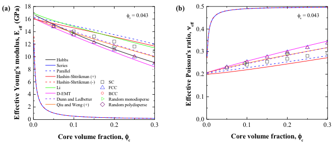 Figure 3. (a) Effective Young’s modulus Eeff and (b) effective Poisson’s ratio νeff of a core-shell-matrix composite as functions of the core volume fraction φc for constant shell volume fraction φs = 0.043. Here, Ec, Es, Em, νc, νs, and νm were those of the baseline case. Figures 4a-4d plot the ratio Eeff/Em of monodisperse core-shell particles packed in SC, BCC, or FCC structures as a function of the ratio Ec/Em ranging from 10-4 to 104 for ratios Es/Em equal to 0.1, 1, 10, and 100, respectively. The ratio Eeff/Em is shown for two values of matrix Young’s moduli Em, namely 1 and 10 GPa. Then, the shell Young’s modulus Es was adjusted to achieve the desired Es/Em ratio. In all cases, the core and shell volume fractions were 0.3 and 0.1, respectively, and the Poisson’s ratios of the core, shell, and matrix were those of the baseline case. Figure 4 indicates that the ratio Eeff/Em was dependent only on the ratios Ec/Em and Es/Em, rather than on the Young’s moduli of each constituent component. It is interesting to note that the ratio Eeff/Em showed little dependence on Ec/Em in the limiting cases when Ec/Em was very small (soft core) or very large (hard core). This suggests that for microencapsulated PCM-concrete composites with a soft care, a variance in the Young’s modulus of the PCM has little effect on Eeff. Additionally, Figure 4 plots the EMAs for Eeff that gave the best agreement with numerical results. The predictions by the upper bound of the Qiu and Weng model agreed the most closely with numerical predictions of Eeff for microcapsules with BCC or FCC packings across the ranges of Ec/Em considered. For cases when Ec was smaller than Em, such as for microencapsulated PCM in concrete, predictions from the D-EMT EMA were in better agreement with numerical predictions than those by the Qiu and Weng model. Finally, for the case when Es/Em = 1, the predictions of the EMA proposed by Hobbs fell within 3% of those for BCC and FCC packing arrangements.