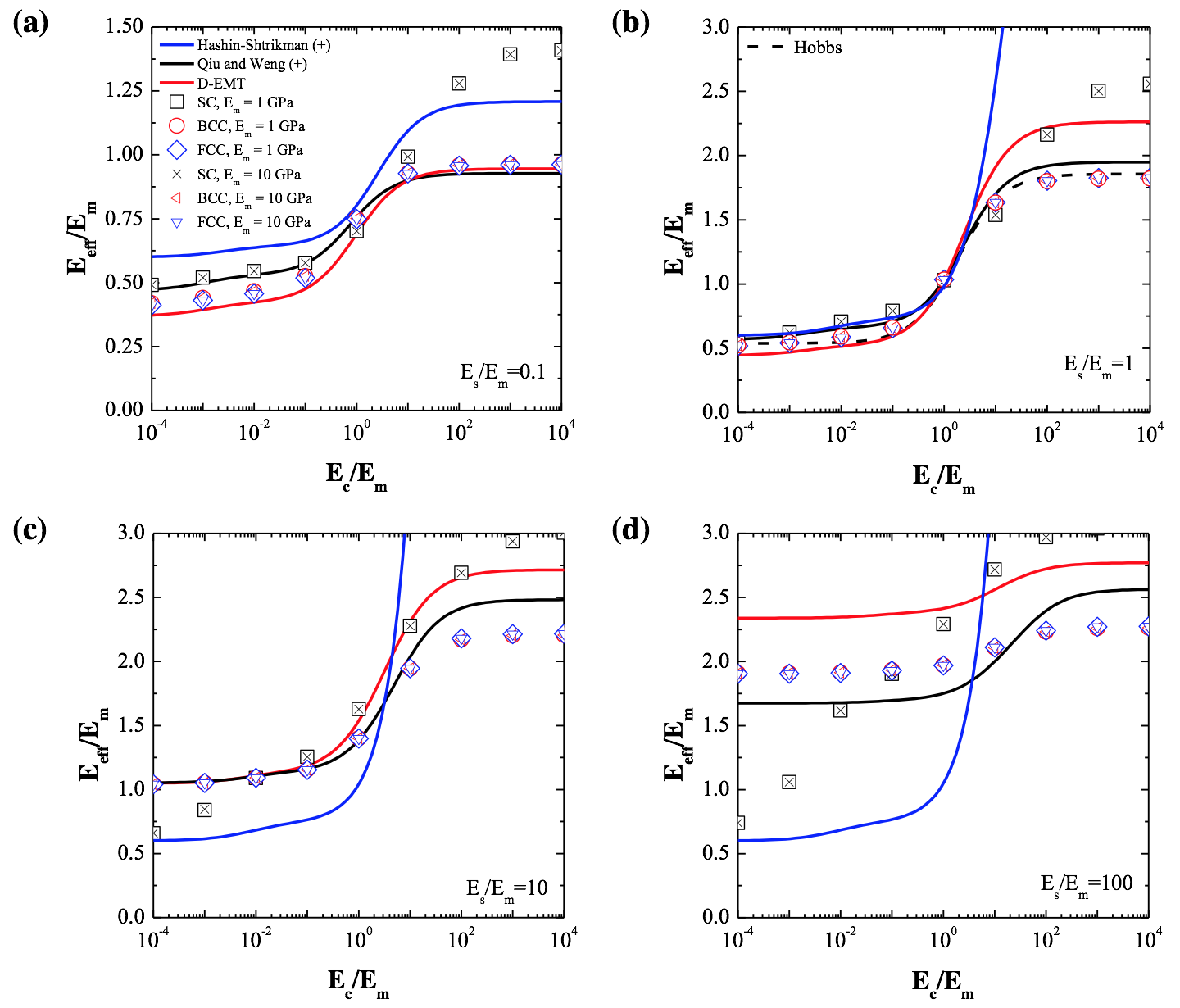 Figure 4. Ratio Eeff/Em of a core-shell-matrix composite for SC, BCC, or FCC packings as a function of the ratio Ec/Em equal to (a) 0.1, (b) 1, (c) 10, and (d) 100. Predictions of EMAs are also shown including the D-EMT EMA [1], the upper Qiu and Weng bound [2], and the Hobbs model [4] (for Es = Em). Here, φc = 0.3, φs = 0.1, νc = 0.499, νs = 0.34, and νm = 0.2. Conclusion