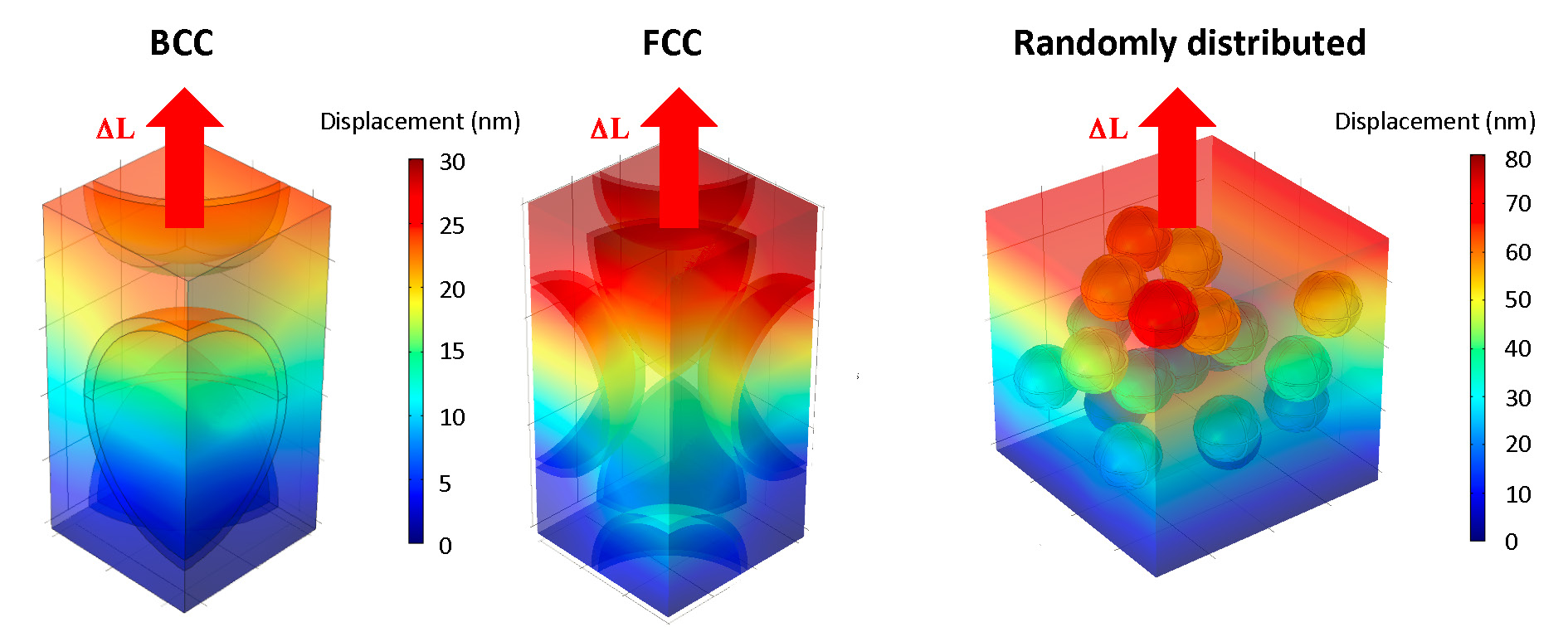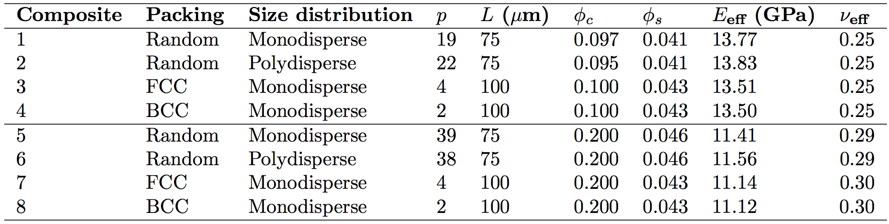 Results and Discussion Table 1 reports numerical predictions of the effective Young’s modulus Eeff and the effective Poisson’s ratio νeff of three-component composite structures consisting of various core and shell volume fractions of monodisperse and polydisperse microcapsules randomly distributed in a continuous matrix with a unit cell length L = 75 μm. It also shows the values of Eeff and νeff for equivalent composites consisting of monodisperse microcapsules with BCC and FCC packing arrangements having nearly identical core and shell volume fractions φc and φs. In the baseline case, the core, shell, and matrix Young’s moduli were taken as Ec = 55.7 MPa, Es = 6.3 GPa, and Em = 16.75 GPa, while their Poisson’s ratios were νc = 0.499, νs = 0.34, and νm = 0.2, respectively. These properties corresponded to a three-component PCM composite consisting of microencapsulated paraffin wax with a polymeric shell embedded in a cement matrix. Table 1 establishes that Eeff and νeff were independent of spatial and size distributions. In other words, BCC and FCC packing arrangements were representative of the elastic behavior of monodisperse or polydisperse microcapsules randomly distributed in a matrix. Table 1. Effective Young’s modulus Eeff and effective Poisson’s ratio νeff of three-phase composites consisting of p microcapsules either monodisperse or polydisperse and either in ordered packing arrangements or randomly distributed in a continuous matrix with until cell length L. Here, Ec = 55.7 MPa, Es = 6.3 GPa, Em = 16.75 GPa, νc = 0.499, νs = 0.34, and νm = 0.2.