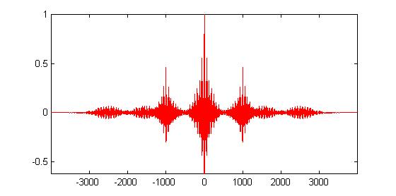 Due to the form of y(n), its autocorrelation function can be shown to have peak values at the time instants n=0, n=N, and n=-N. [You are asked to establish this fact in the exercises.] We show below a plot of the normalized auto-correlation function (or sequence) of a signal y(n) with an echo characterized by a =0 .8 and N=1000. [The function is normalized so that its peak value at n=0 is unity.] It is clear from the plot that there are peaks at the samples 0, 1000, and -1000.