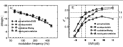 The perceptual sensitivity to this amplitude-modulation cue was analyzed using three psychoacoustic models. The first is an envelope-statistic model, adapted from (5)(6), that uses a 3-kHz bandwidth filter, half-wave rectification, 90-Hz low-pass filtering, and a normalized fourth-moment statistic. The second, adapted from (7)(8), uses 6 4th-order gamma-tone filters (from roughly 4.5 to 7.5 kHz), half-wave rectification, 1-kHz low-pass filtering, modulation filtering with a Q3dB of 2, internal noise, and a standard deviation statistic. The third, motivated by (9)(10)(11), uses the same 6 filters, half-wave rectification, 280-Hz low-pass filtering, and then computes the running autocorrelation in each channel. The channel-autocorrelations are summed across the 6-channels to generate a summary autocorrelogram. The model's statistic is the peak difference between any two summary autocorrelogram values at delays of t and t/2. Figure 3A shows each model's prediction of temporal modulation transfer functions (5)(perceptual data is an interpolated average from (6) and (8)). Figure 3B shows [s z] discrimination predictions for each model, together with perceptual thresholds tracked at two d' values. The third model's predictions best approximate the perceptual discrimination of high-pass filtered [s] and [z] in noise. [Work supported by NIDCD grant #DC02033 and the NSF.]