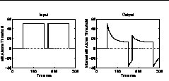 The firing patterns of auditory neurons show clear evidence of adaptation [3]. In response to a long-duration tone pulse, a single neuron provides a strong onset response which then decays with time to a weaker steady-state response. After the offset of a tone pulse, the neural response initially drops below its resting rate, and then slowly recovers. While the neuron is still recovering, the onset response to a similar second pulse will be weaker than it was to the first. The decaying response after onset is often called adaptation, and the increasing response after offset is called recovery. Adaptation and recovery are measured throughout the nervous system at a wide variety of rates, but recovery is often 3-4 times slower than adaptation [4]. For this work we focus on the adaptation and recovery which are significant at phonemic and syllabic rates (10-200 ms). Figure 2 shows a simulated response to two identical pulses. Notice the weaker onset response to the second pulse.