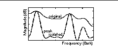 Modification of the cepstral liftering process addresses these issues [6]. A cepstral vector is first obtained from the original spectral estimate using a DCT. The cepstral vector is bandpass liftered, and an IDCT is used to obtain a modified spectral estimate. Peaks in the original spectral estimate are generally above zero, while valleys are below. The modified spectral estimate is half-wave rectified. Peaks in the modified spectral estimate are then scaled to the height of the original spectral estimate at that frequency position. A DCT of the modified, rectified, and scaled spectral estimate is used to obtain a final cepstral vector. In Figure 4, an IDCT has been used to show the spectral estimate implied by the final cepstral vector.