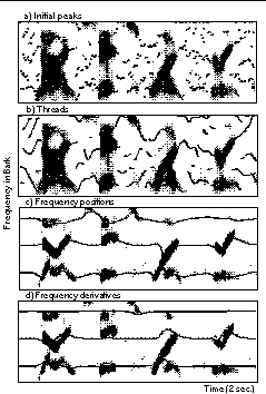 Two stages are used to group the local peaks based on their spectro-temporal proximity. The first uses dynamic programming to connect the peaks into threads. Each peak in each frame connects to the closest thread that extends to at least one of the last two frames. If the closest frequency distance is more than roughly 10% of the entire (warped) frequency range, then a new thread is started. When no peak connects to a given thread for two consecutive frames, that thread is ended. Figure 5.b shows a moving seven-point second-order polynomial fit to each thread. Frequency-derivative estimates from the moving polynomials are stored for each peak.