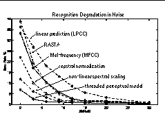 Background noise, shaped to match an estimate of the long-term average speech spectrum, was added to corrupt the speech signal for these evaluations. In addition to evaluations using linear prediction cepstral coefficients, Mel-frequency cepstral coefficients, and the relative-spectra (RASTA) technique [12], tests were performed using MFCC with five common techniques that are intended to improve feature-vector robustness: spectral subtraction, spectral scaling, non-linear spectral scaling, cepstral mean subtraction, and cepstral normalization. The top two of these last five are included in Figure 6.