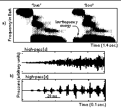 Figure 7.a is a spectrogram of the two syllables: "sue zoo." In a typical ASR system, the presence of low-frequency energy during the voiced fricative [z], would largely distinguish that sound from the unvoiced fricative [s]. Preliminary data indicate that listeners, on the other hand, are able to distinguish these sounds at a low SNR even after the signal is high-pass filtered above 3 kHz. In Figure 7.b, notice the pitch-rate amplitude-modulation cue in the temporal waveform of [z] after high-pass filtering. We are currently parameterizing models to predict the perceptual sensitivity to this cue, and are working to incorporate the model's response into an ASR system.