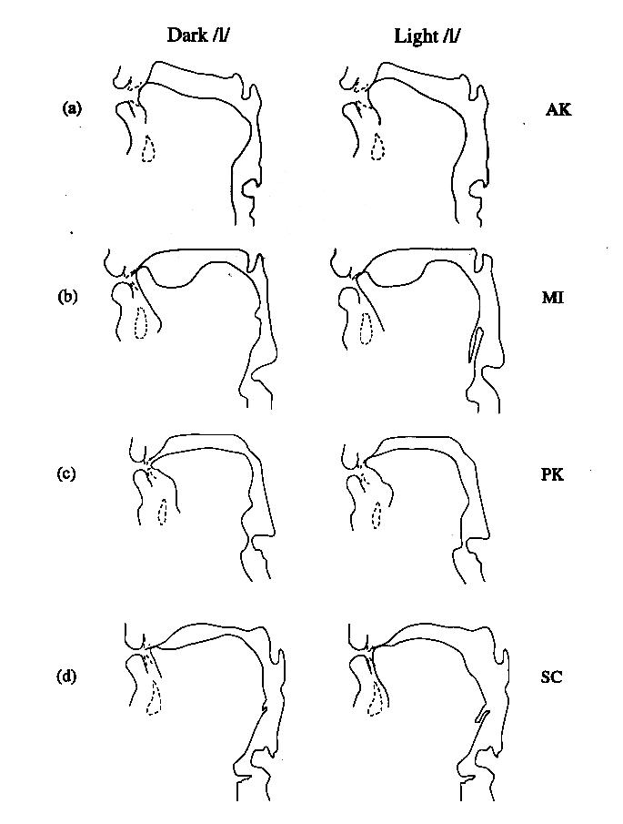 Tracings of the midsagittal profiles of the vocal tract for dark and light /l/ (AK and PK are females; MI and SC are males). The front incisors and the jaw are shown in dashed lines.